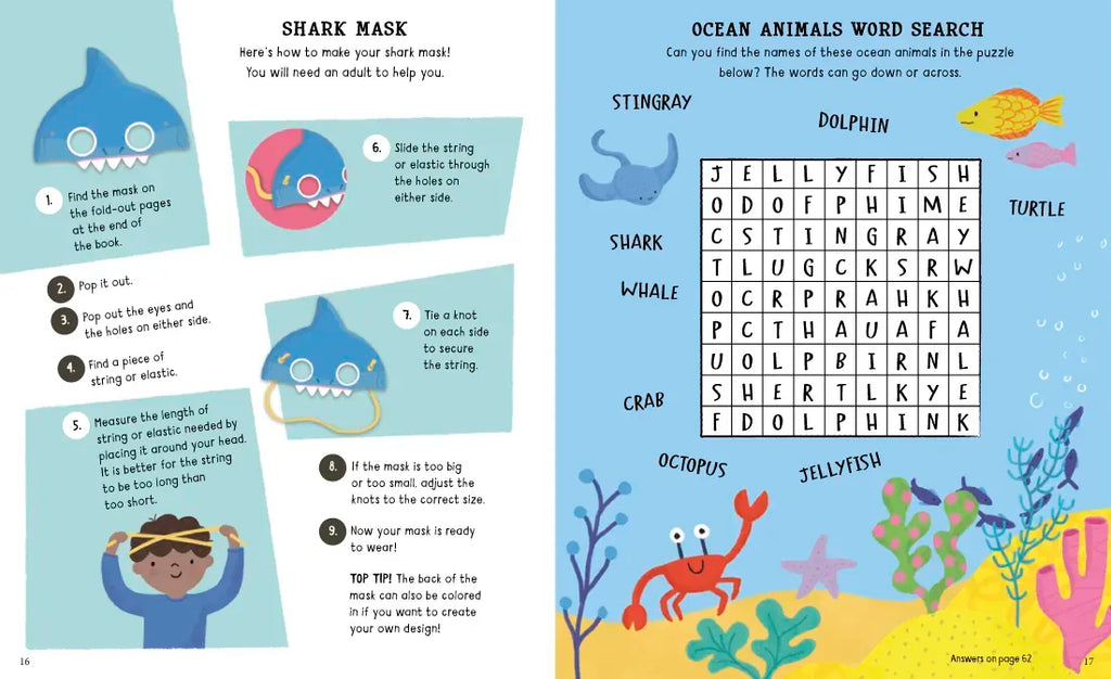 Young fans of the ocean and its inhabitants will have hours of fun with this activity book! Readers will love to complete the delightful puzzles, coloring scenes, and ocean-themed crafts that most children can do themselves and with common household items. This engaging activity book includes a press-out shark mask, a door hanger to personalize, ocean-themed stencils, and more than 100 colorful stickers for young artists to decorate their creations.
