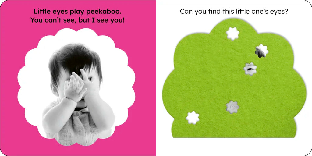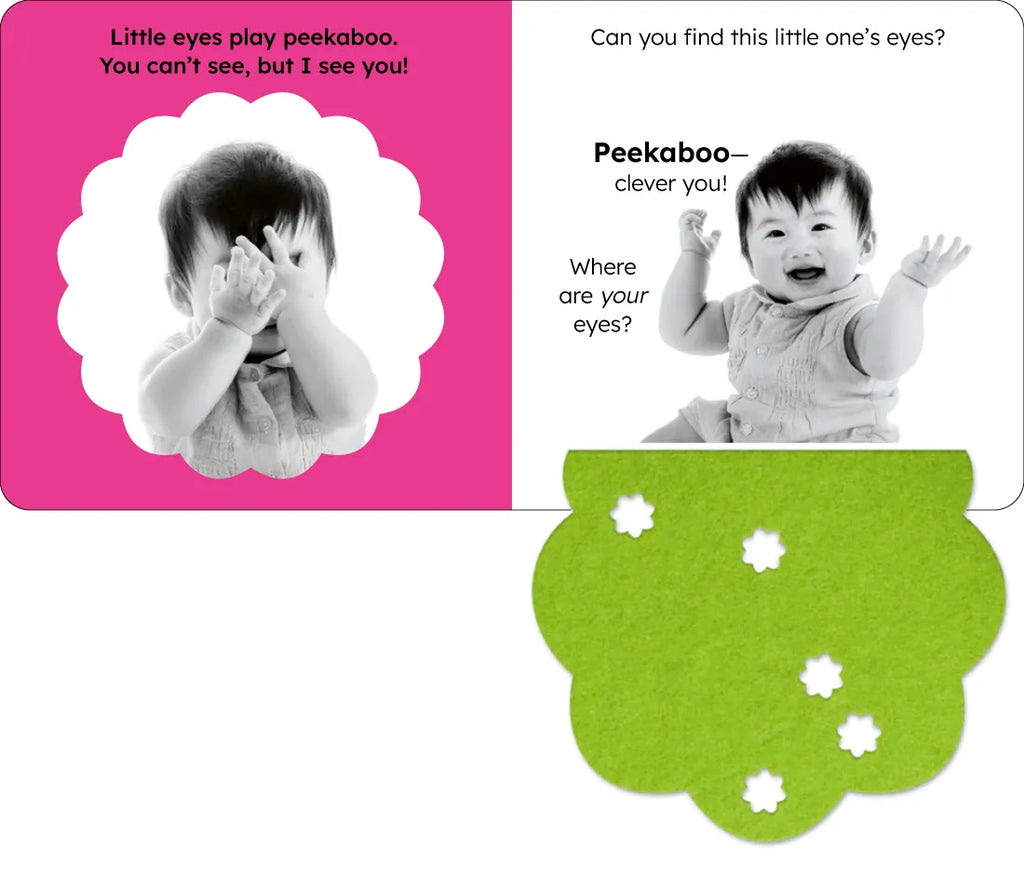This new interactive peekaboo board book features black-and-white photographic images of adorable babies and toddlers, felt flaps in florescent colors, and a die-cut cover!