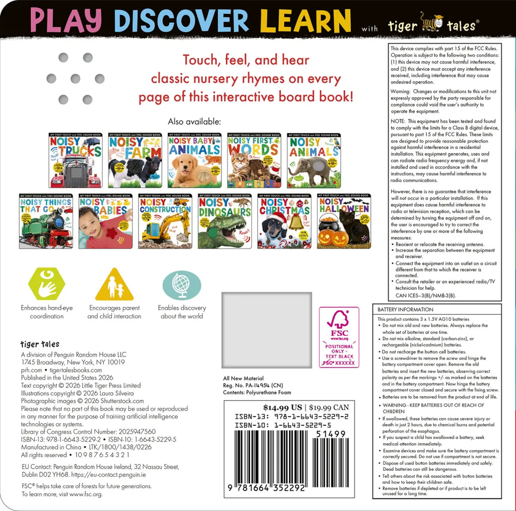 This latest addition to the My First Touch and Feel Sound Book collection from Tiger Tales features a mix of full-color photographs and colorful illustrations depicting 6 classic nursery rhymes! Young readers are introduced to "The Itsy Bitsy Spider," "The Wheels on the Bus," "Old MacDonald Had a Farm," and more. A sound button and touch-and-feel element on each spread encourage active learning. The book also includes an on/off switch on the back to preserve battery life.