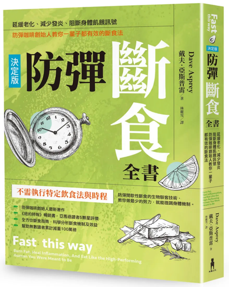 「防彈咖啡」創始人戴夫.亞斯普雷提倡的「防彈飲食」近年風靡全球,藉由「生物駭客」技術,揮別困擾現代人的各種文明病,不僅能夠減重,更換來高品質的生活與健康。在新作《防彈斷食》中,他更進一步整理十多年來的斷食心得與祕訣,目的就是要讓更多人知道:「斷食」並不等於受苦、挨餓、脾氣暴躁,反而可以樂在其中。