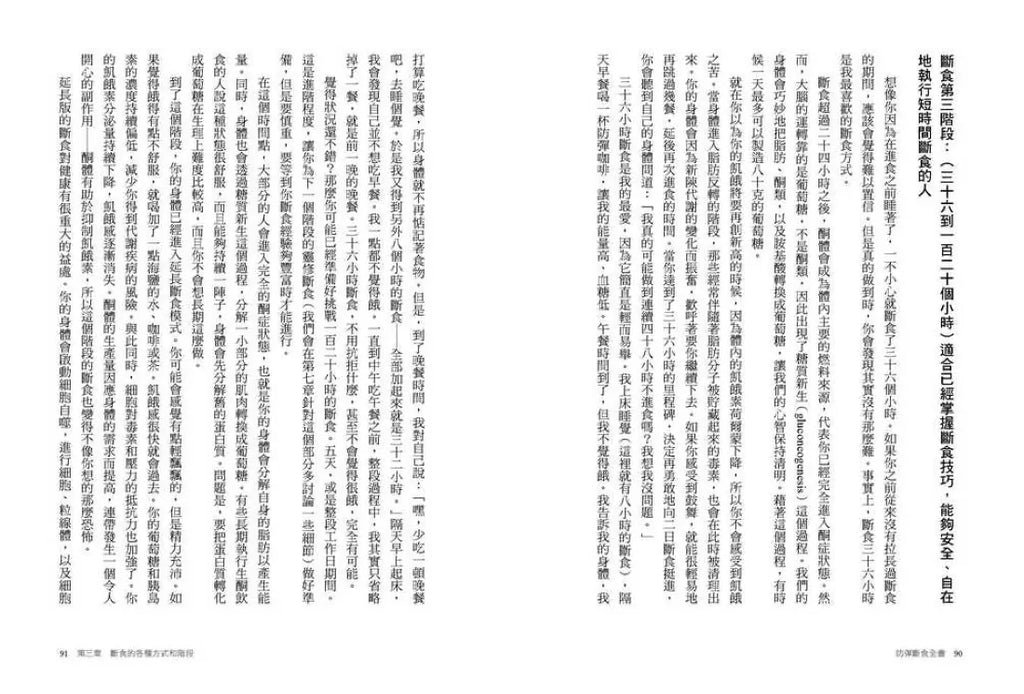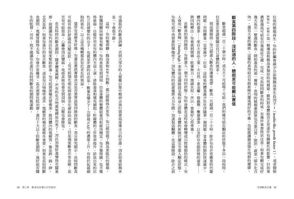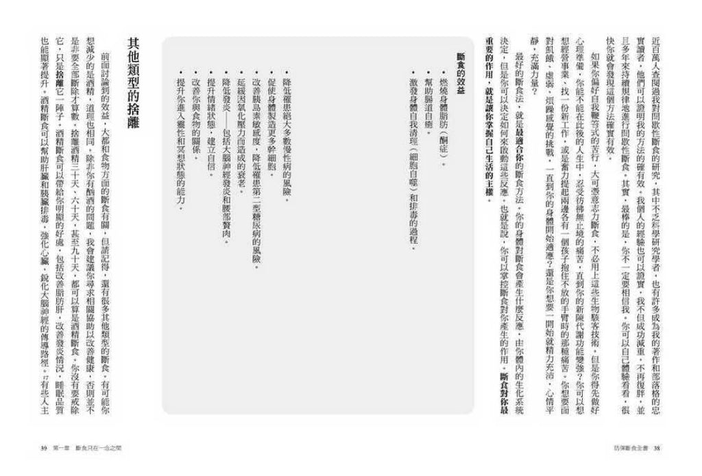雖然近年嘗試各種形式「斷食」的人愈來愈多,但此書不僅提供執行指引,背後也有相對完整的理論支撐,讓人能夠理解其所以然。在精神層面上,作者對於可能面對到的困難與挑戰,也有充分的準備和預期,能讓初次嘗試斷食的人有所依循。