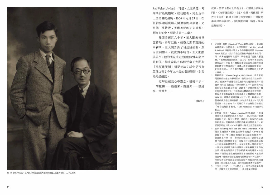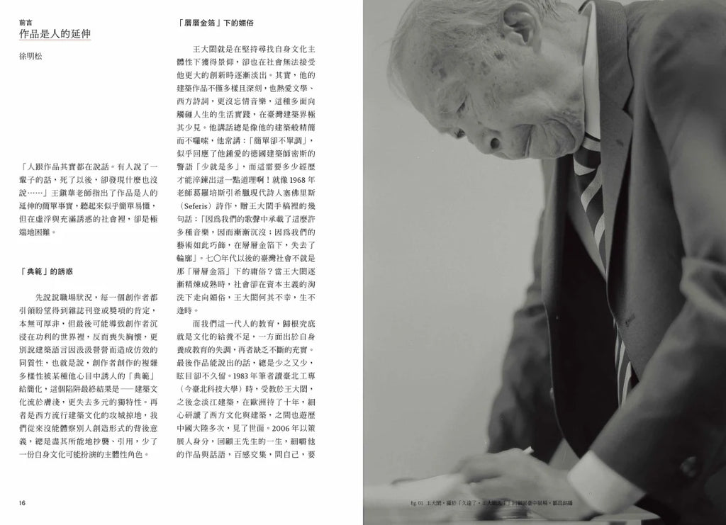 提起王大閎,令人立即聯想到國父紀念館,這是他最廣為人知的作品。可是對許多六〇年代以後出生的人來說,他彷彿是武俠小說家筆下的世外高人,鮮少認識他的其他作品和生平點滴。以往我們只識作品不識其人,如今我們不妨揭開神祕面紗,從人去貼近作品。或許,從人與人文的角度進入,我們才有機會接近建築的核心。