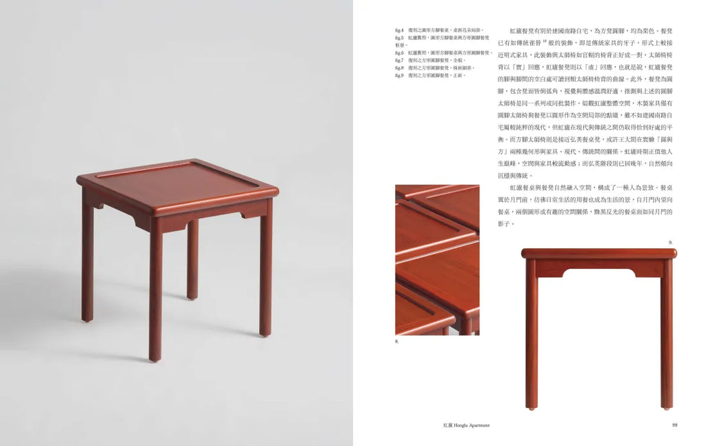 本書以建國南路自宅(1953)、虹廬(1964)、弘英別墅(1979)三棟住宅為核心,收錄各空間由王大閎設計的代表性家具共24件,包括貝殼茶几、太師椅、八角餐桌、金箔矮櫃、紅黑白沙發、花瓶章魚腳立燈、雙面屏風等。