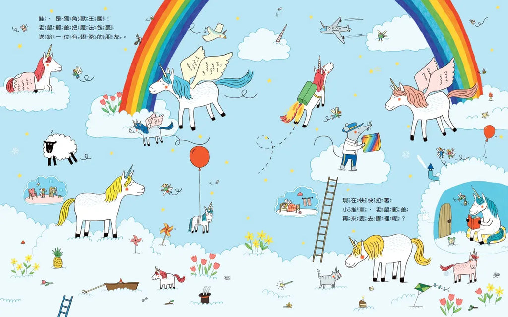 就像每天早上一樣,老鼠郵差為了送信早早起床,但這個早上,老鼠郵差不開郵務車,而是搭上了火箭……前往XYZ星球、糖果王國、迷你鎮和巨人鎮,從美人魚的家潛入海底兩萬哩,接著來到怪獸國、機器人工廠、上下顛倒國,再飛到朵朵白雲上的獨角獸王國,當老鼠郵差送包裹時,什麼也擋不住他!