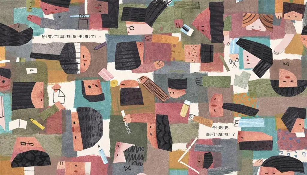 作者巧妙運用油性粉彩與油性色鉛筆,創造不同質地、顏色與形狀的紙做拼貼。其豐富度與色彩令人目光為之一亮,每一個小小人物彷彿都在說話呢!