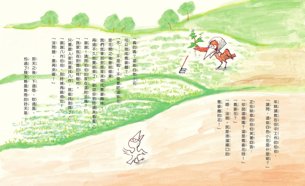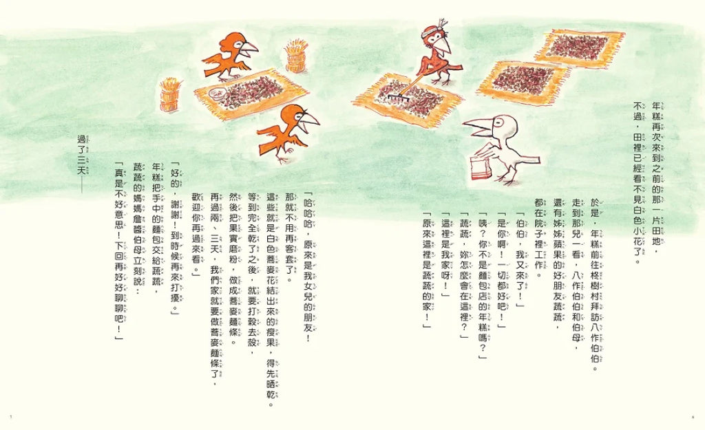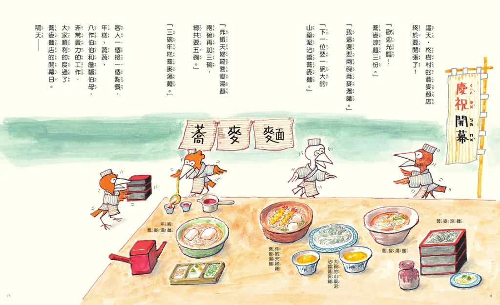 在《烏鴉蕎麥麵店》中,加古里子鉅細靡遺的描繪了蕎麥麵的製作過程:採收果實、打穀去殼、研磨成粉,然後是和麵、揉麵、擀麵、切條、煮熟、沖洗、瀝乾……,每一道步驟都馬虎不得,每一根麵條都是汗水的結晶。這樣真材實料、精工細作的堅持和努力,才能成就餐桌上令人垂涎的佳餚,同時也是食農教育的絕佳典範。