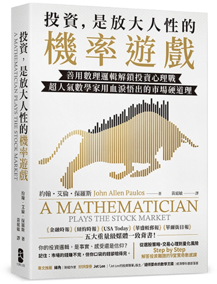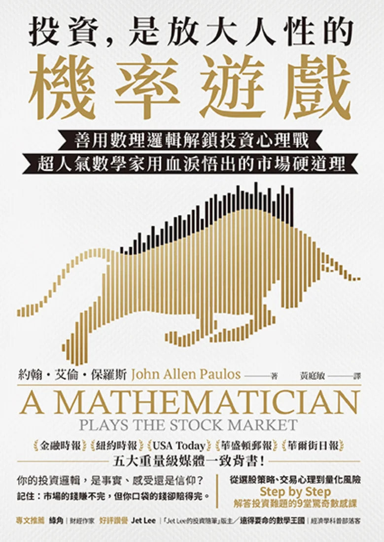 「投資可以用數學解釋,但人性會是重要成敗因素。我們可以用數學公式評估投資報酬率,但無法預測人性會怎麼左右金融市場。作者用深入淺出的數學原理,來闡釋許多投資小故事,更能讓我們認清投資的真實樣貌,以及如何在市場不確定性中獲利。」 ──Jet Lee|「Jet Lee的投資隨筆」版主
