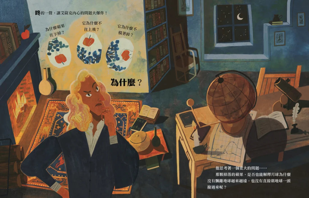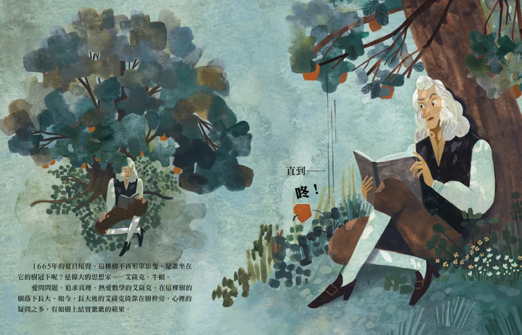 對於身為文科生的我來說,在面對理科方面的知識時總是一竅不通,甚至覺得枯燥乏味。但當我在編輯這本繪本時,深深感受到科學與歷史擦撞出的火花,並被這樣的內容題材吸引,那就是作者以獨到的敘事角度,重新詮釋了牛頓萬有引力定律的起點──蘋果樹。