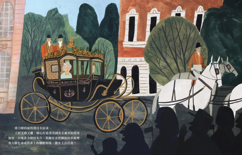 在編輯的過程中,令我感到驚奇的是,重力樹的木材竟也鑲在英國女王乘坐的皇室馬車上!雖然書中所提及的傳奇人物皆不復存在,但這樣的一棵樹卻能縱橫古今,穿越三百五十年的歷史,化成各種姿態,舉凡椅子、馬車裝飾、新的植株等,存在於生活中,正如同牛頓的萬有引力定律,永垂不朽。