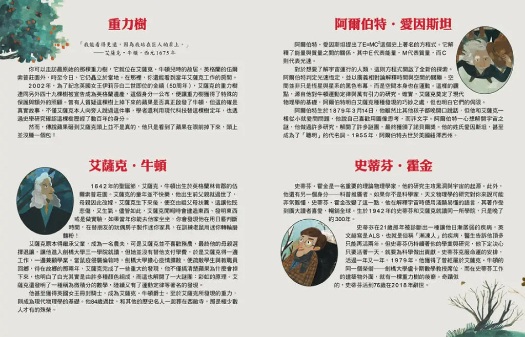 本書最後附有牛頓、愛因斯坦和霍金的介紹,以及重力樹的相關資訊、牛頓生平大事年表,讀完繪本後,透過這些資料,更加了解歷史傳奇人物的背景。