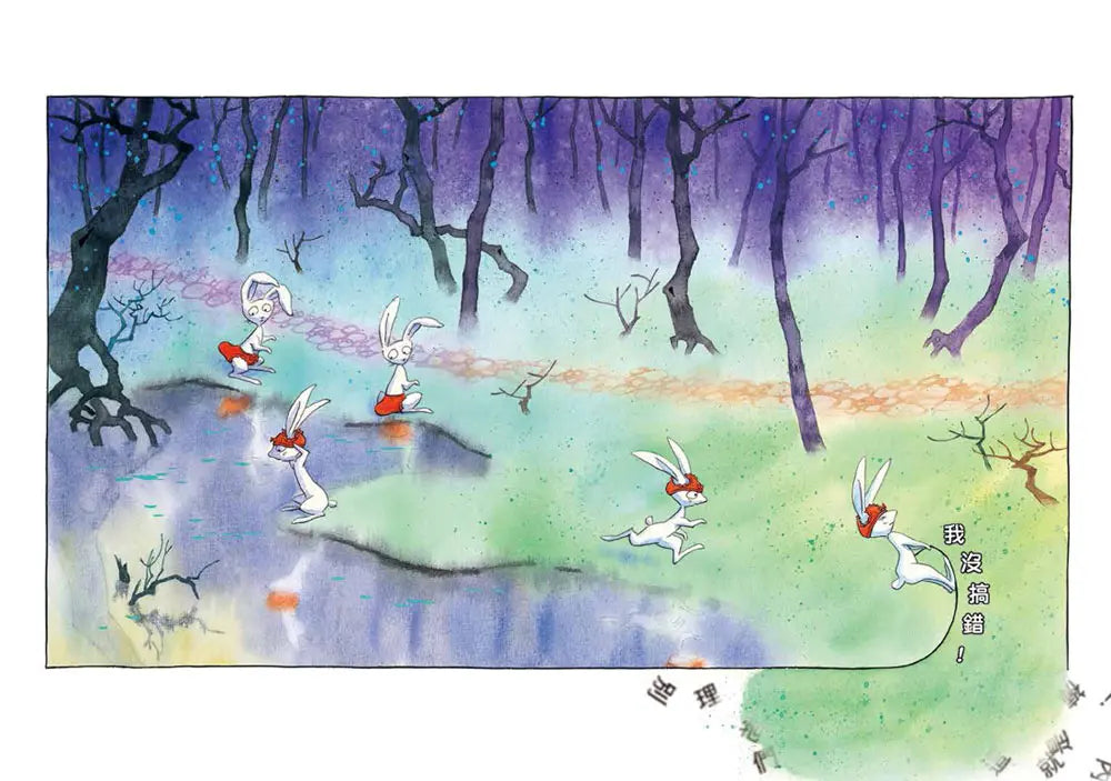 借用傳統繪畫的因素,我們把它怎麼用?小兔子的世界所有的樹是藍顏色的,人類的世界所有的樹是綠顏色的,當小兔子進入小樹林就是夢幻般的世界,這個世界非常幽深,這個世界裡面發生很多好玩的事情。