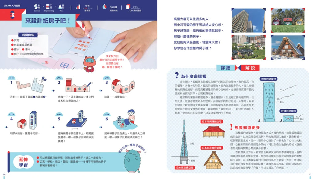 以貼近孩子生活經驗的實驗活動為主題,結合插圖、照片與互動式操作,讓孩子可以藉由玩樂,廣泛探索STEAM的不同面向,如材料與材質特性、自然現象的成因、建築設計的應用等,並從中收穫知識與滿滿的成就感。
