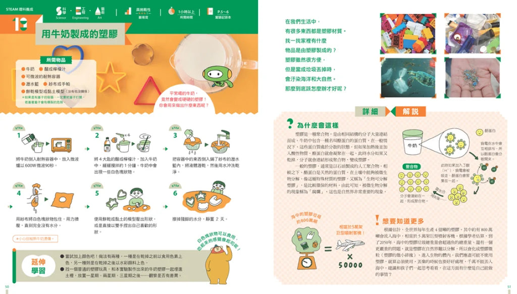 再來和大家分享另外一個有趣的實驗,書中的第19個活動結合「S科學」、「E工程」和「A藝術」三個領域,利用牛奶和醋的化學反應做出「生物可分解塑膠」。這時候,孩子就可以畫下自己設計的作品,也可以把牛奶塑膠和一般塑膠埋進土裡,每週觀察變化,並把這些過程寫進「實驗記錄本」的表格裡,一篇又一篇的自然觀察筆記就成形了,甚至可以延伸做為日後參加科展的素材呢!