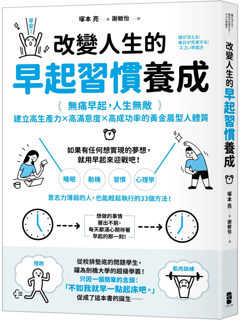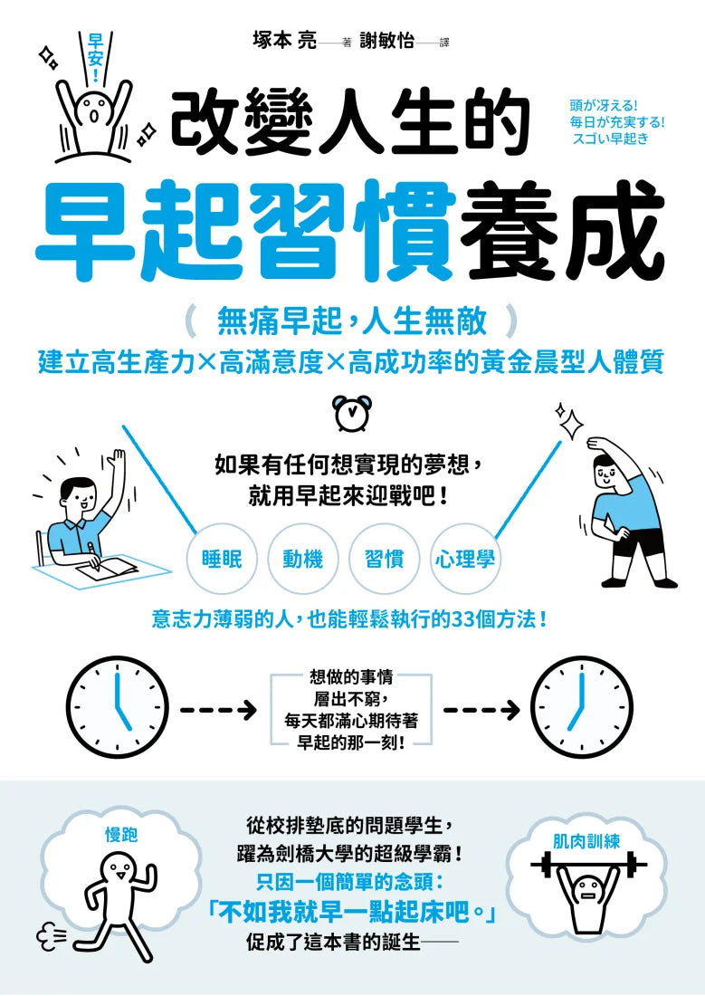本書以心理學為基礎,搭配作者親身經驗,用簡單易懂的方式介紹33個最實用的早起訣竅,不需要依賴毅力和意志力,每個人都能輕鬆養成早起習慣。同時,書中還會分享如何打從根本改變看待時間的態度,讓工作和人生都變得更充實的祕訣,度過快樂的每一天。
