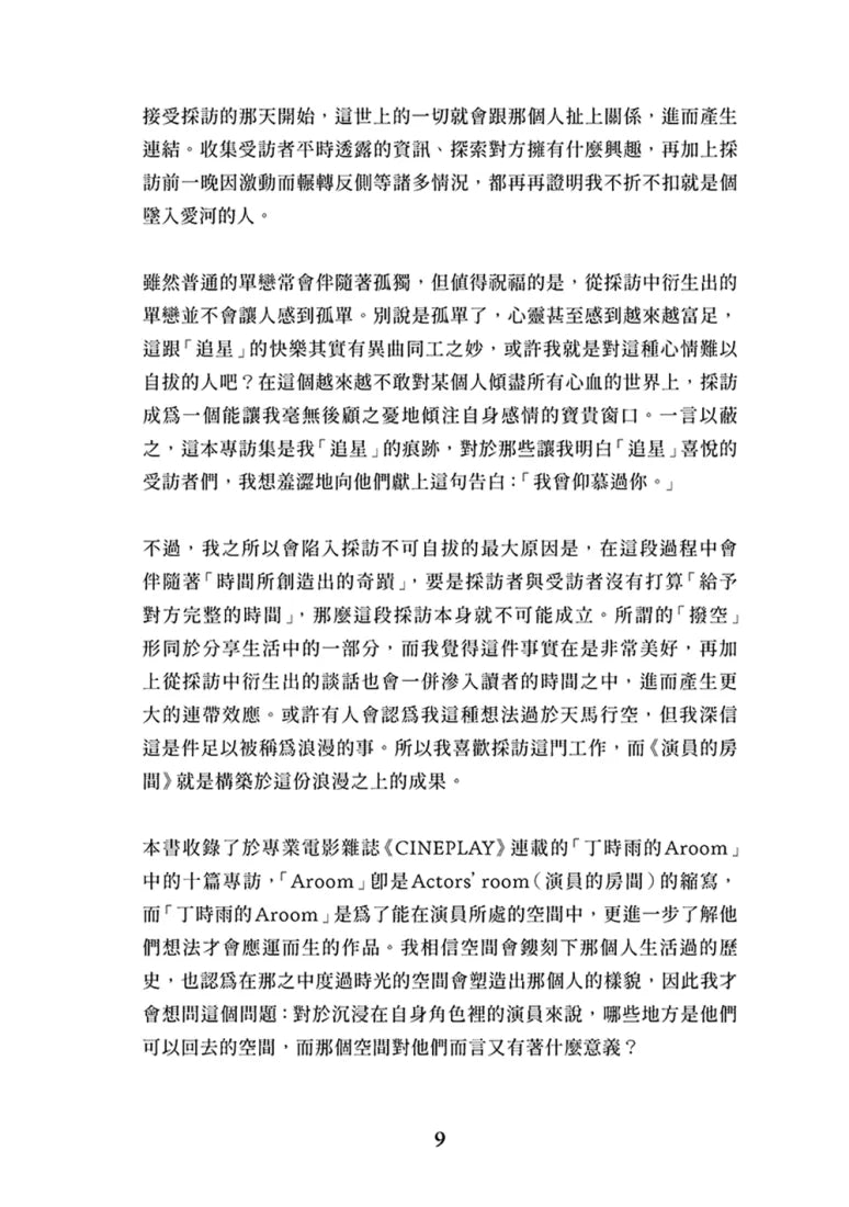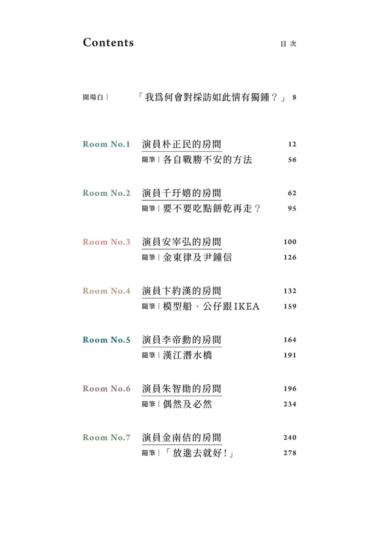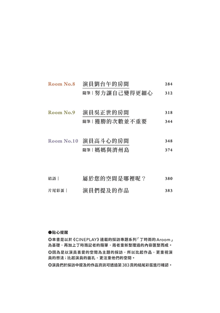 演員的家、演員的社區、演員的工作室⋯⋯那些從角色中抽離,能夠看見演員本來面貌的地方。這不只是一本明星訪談,而是一次走進「演員的房間」的溫暖邀約。