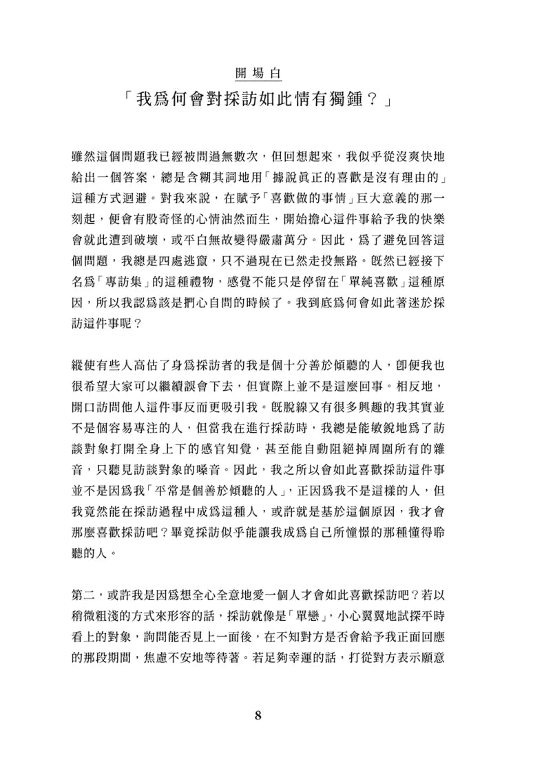 除了訪談內容,作者更在每次對談後寫下充滿感悟的隨筆,分享她如何在探訪這些獨特空間的過程中,重新認識自己,學習創造屬於自己的空間。願這趟穿梭於演員房間的旅程,也能啟發每個讀者重新審視自己的生命風景,找到屬於自己的一方天地。