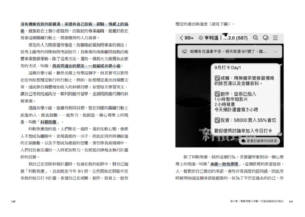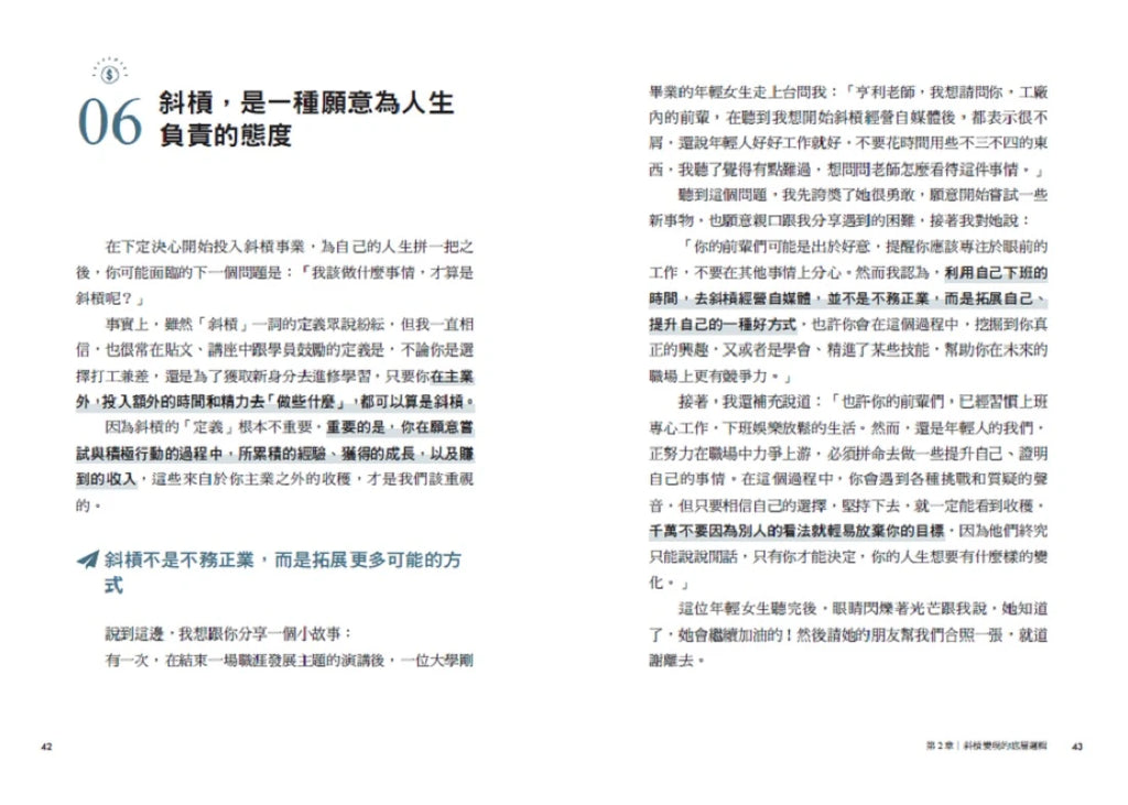 最後,作者還要教你如何從0打造高效斜槓生活,架構自己想要的未來。你將可以向這位輔導過上百位學員的斜槓教練學到: