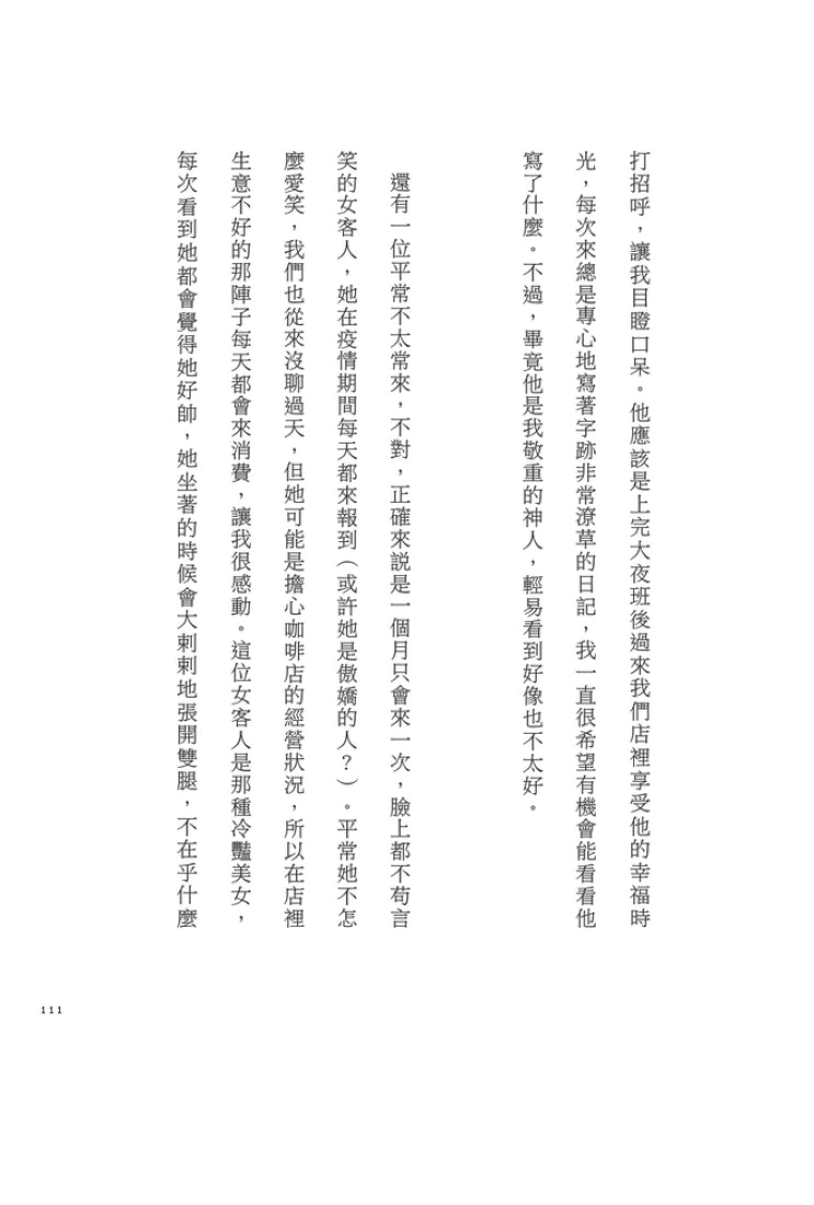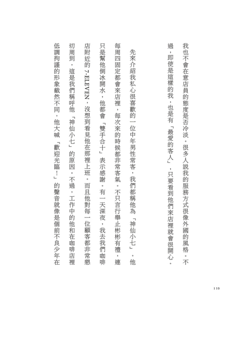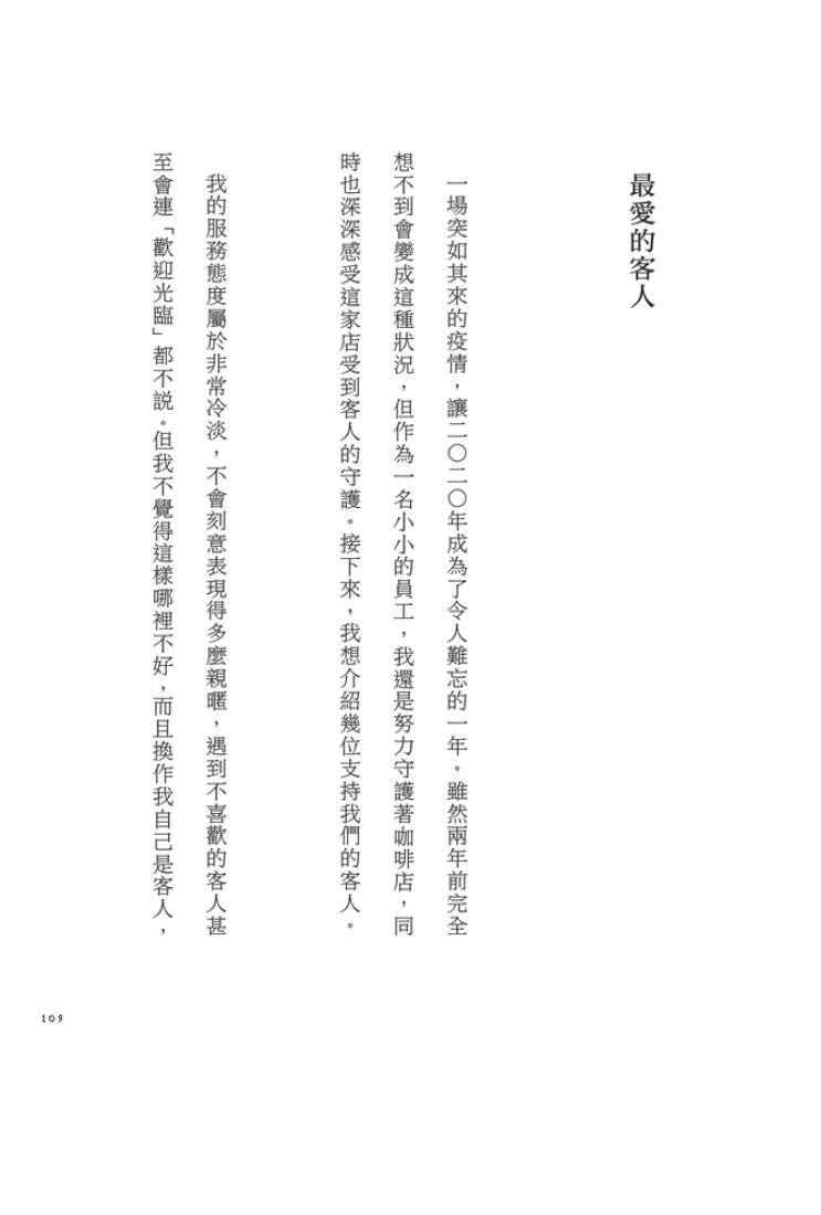 「在人生陷入最低潮時,我開始在這家咖啡店工作,這裡的一切徹底顛覆了我過去所有的常識和價值觀。上班時間可以隨意聊天,髮型、髮色隨店員高興,與顧客的互動方式也很自由;還可以跟客人吵架,甚至可以禁止客人光顧。坦然面對自己的感受,讓我終於能夠肯定自己,或許我一直都很想說出『請不要再來了』這句話。遇到客人說『我是客人欸』、『你是店員還這樣』時,我也能回嗆他『店員也是人啊』。店員也是有感情的。我們和大家一樣都是人,也都是對某人而言重要的人。」