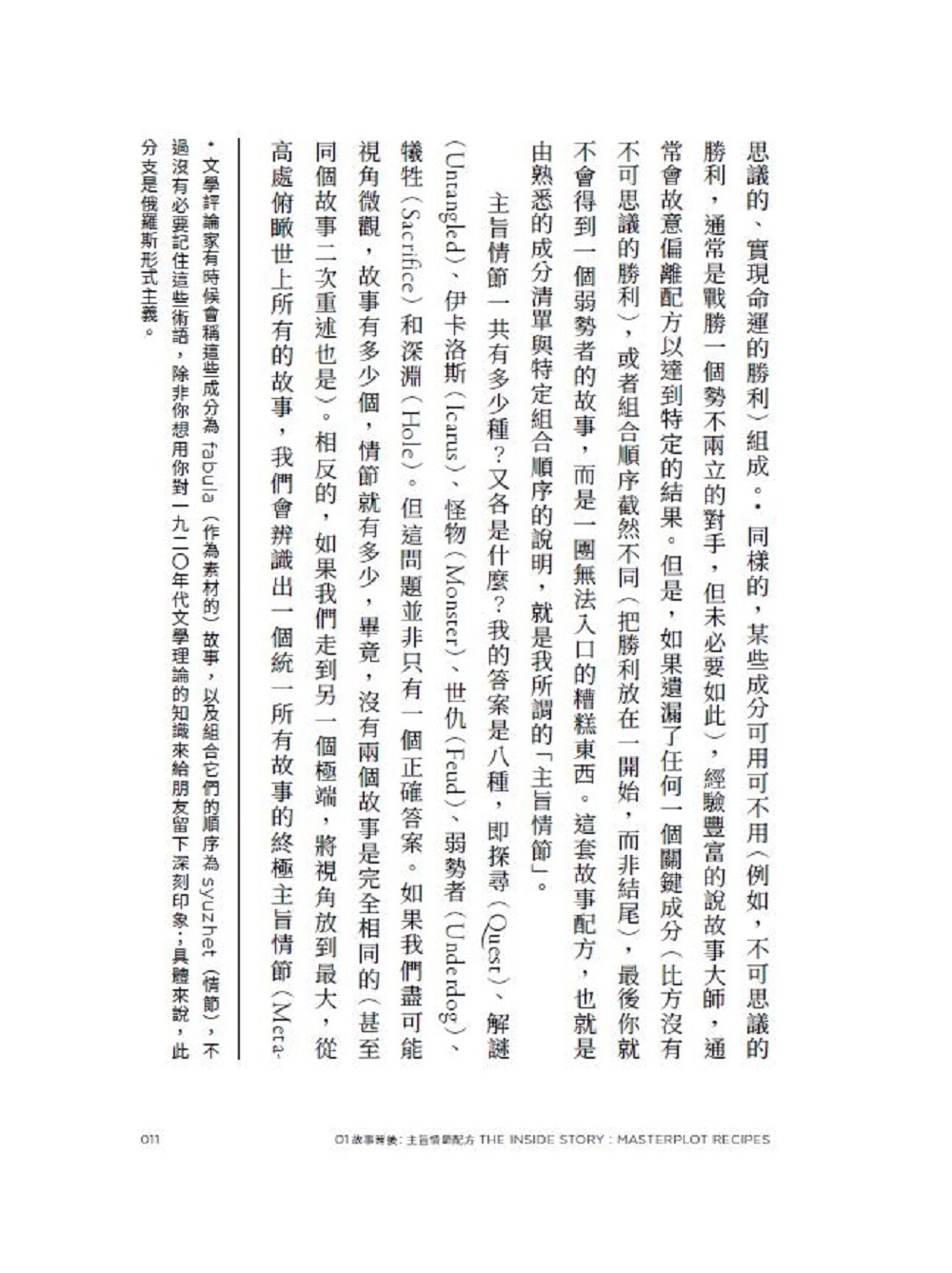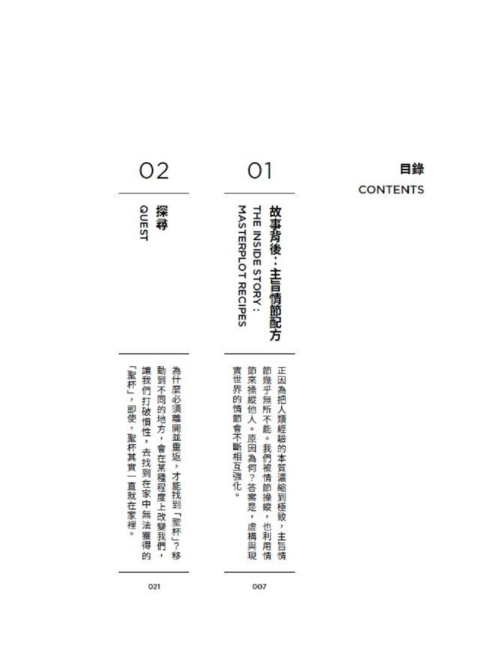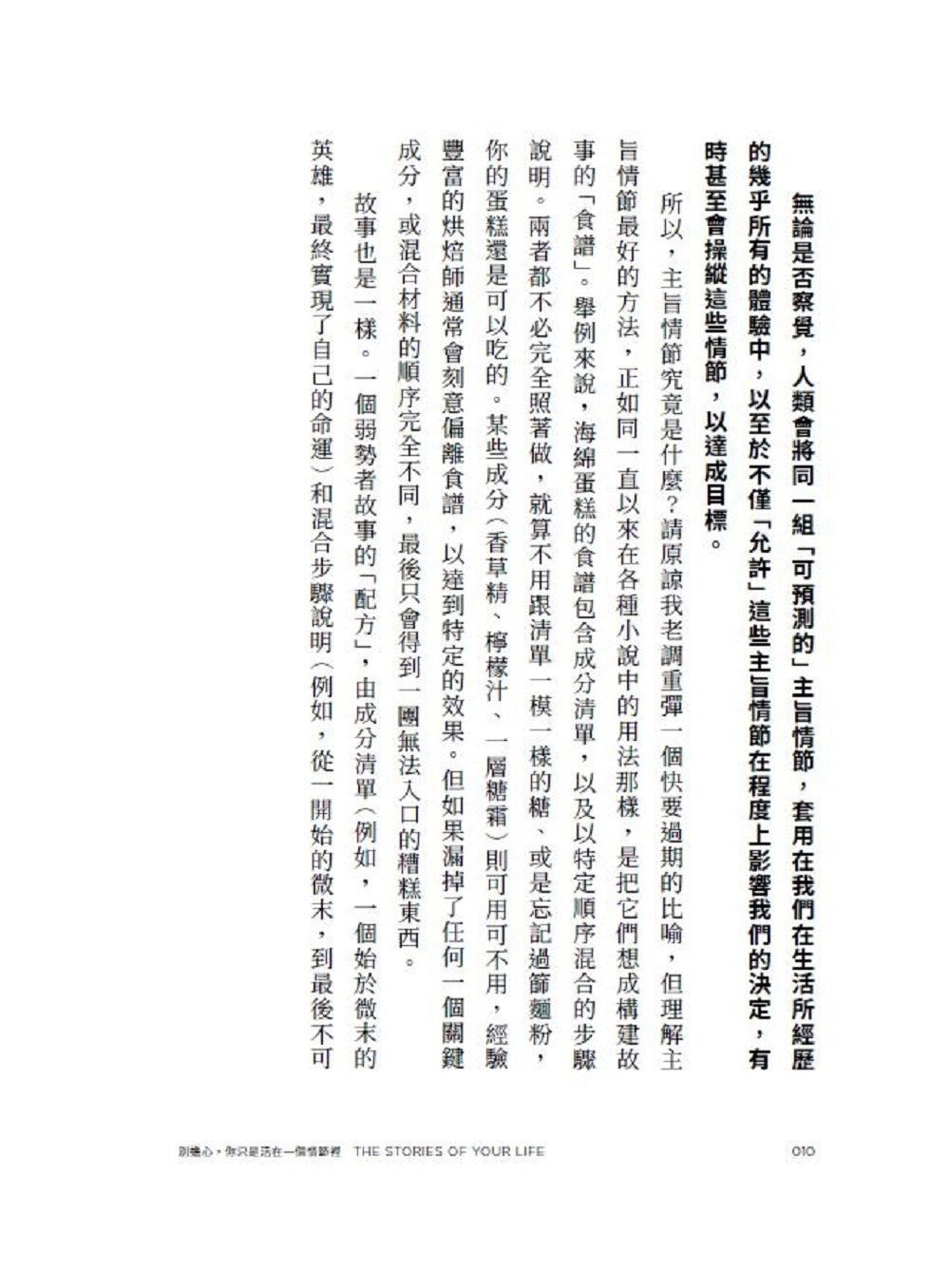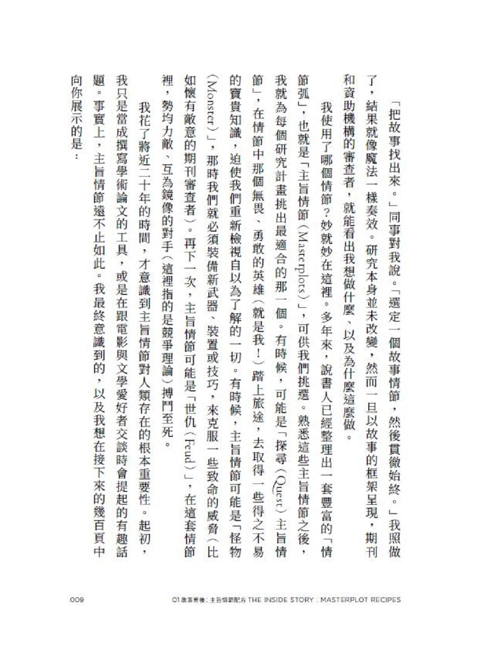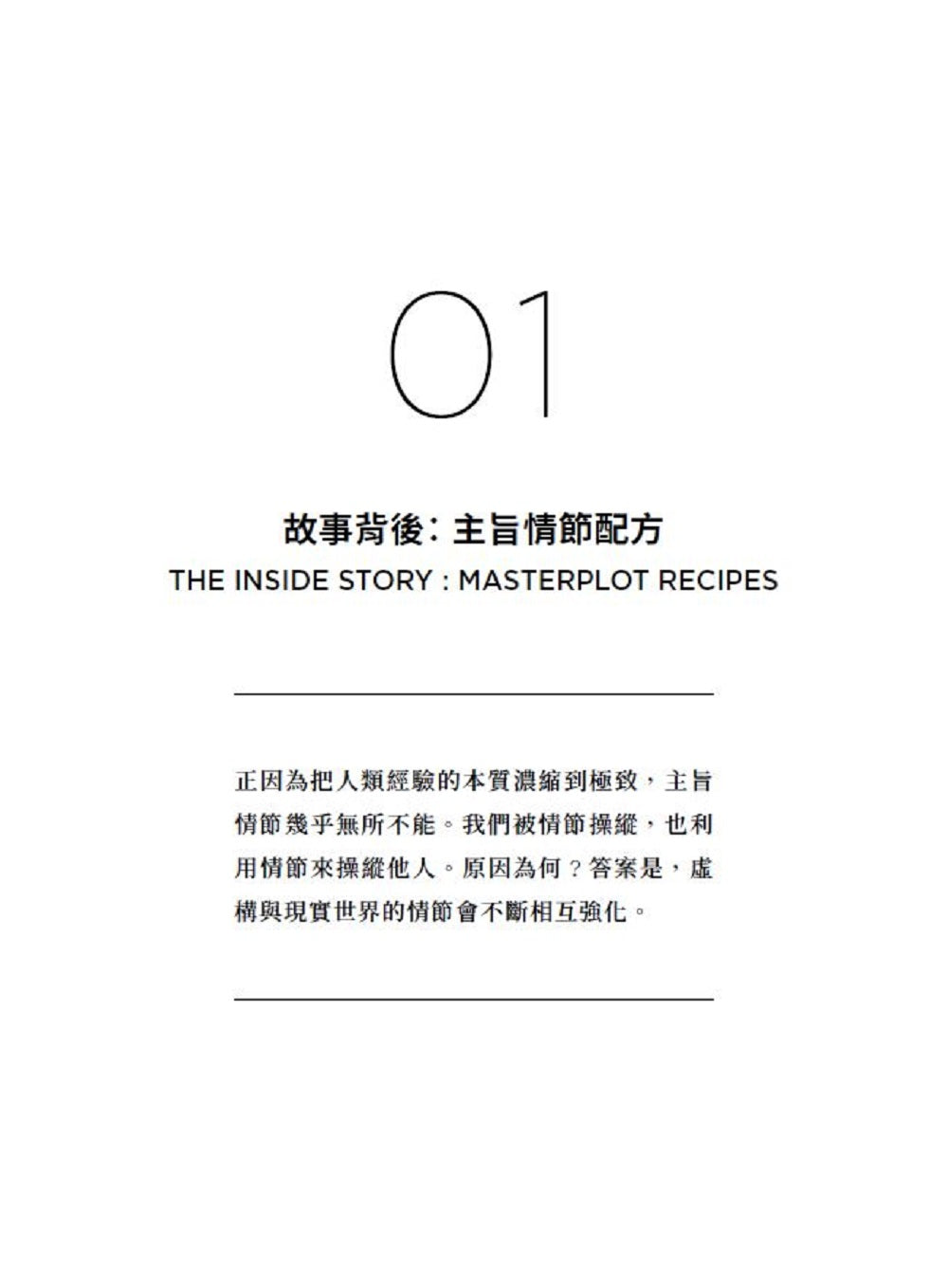 這是一本幫助你理解自我行為模式的實用指南,作者為探尋、解謎、伊卡洛斯、怪物、世仇、弱勢者、犧牲、深淵八大「主旨情節」(masterplot)提供了一份六個階段的「路線圖」。順著路線前進,我們可以深入了解每個主旨情節的構成、在虛構世界與現實生活中如何應用、背後的心理學原理,以及情節是如何被使用或濫用的。