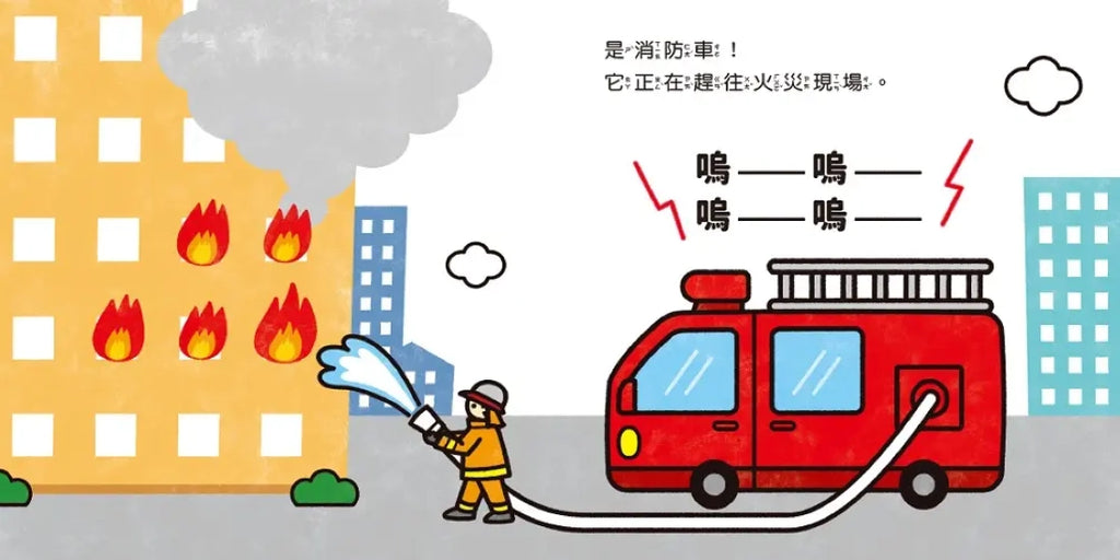 根據2~4歲孩子的理解程度設計車子的外形,線條簡潔、用色鮮明,差異之處正好與該種工作車的用途或特色有關,例如消防車的差異之處是雲梯和高壓水槍,用途是「趕往火災現場」救火;救護車車頂有著紅色的警示燈,因為它「會將傷患和病人送往醫院」,緊急時刻需要鳴笛亮燈,提醒其他車輛讓道……孩子可以自己找找看有哪些不同的地方,家長在旁適時補充其設計用途,讓孩子不僅能夠在「找到了!」的瞬間感受到喜悅與成就感,也能培養觀察力與專注力。