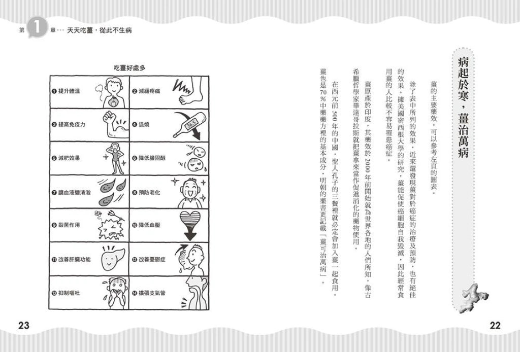 作者石原新菜醫師自己也是乾薑療法的受益者,原本一直為便秘、生理不順、痔瘡及青春痘所苦,在與名醫父親石原結實交流後,開發出「乾薑排寒保健法」。只要利用烤箱就可在家輕鬆炮製乾薑,在常溫下可以保存3個月,磨成薑粉後,加在熱水、紅茶、湯、飯、麵中,每天吃一點,就能改善各種疑難雜症。書中提供包含主食、飲料和甜點的14道對症食譜,隨時為健康加溫!