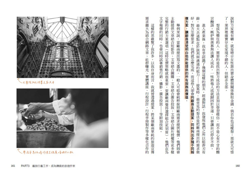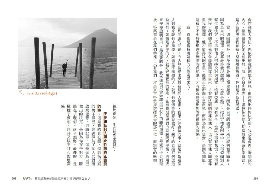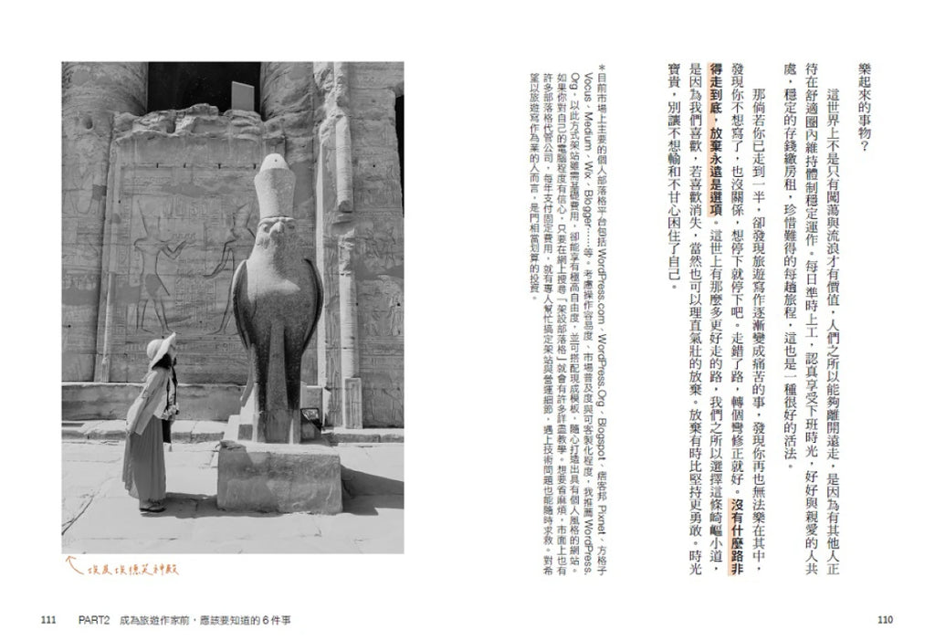 多數人看待「活成自己嚮往的樣子」,只見到浪漫的表象,但旅遊作家就如同其他自由業,只有讓自己的能耐被「買單」,路才能走得遠。無論你是正掙扎於要跳脫常軌、已經踏上嚮往的路,或選擇了放棄,都願你能從本書分享中,看見不一樣的人生風景。