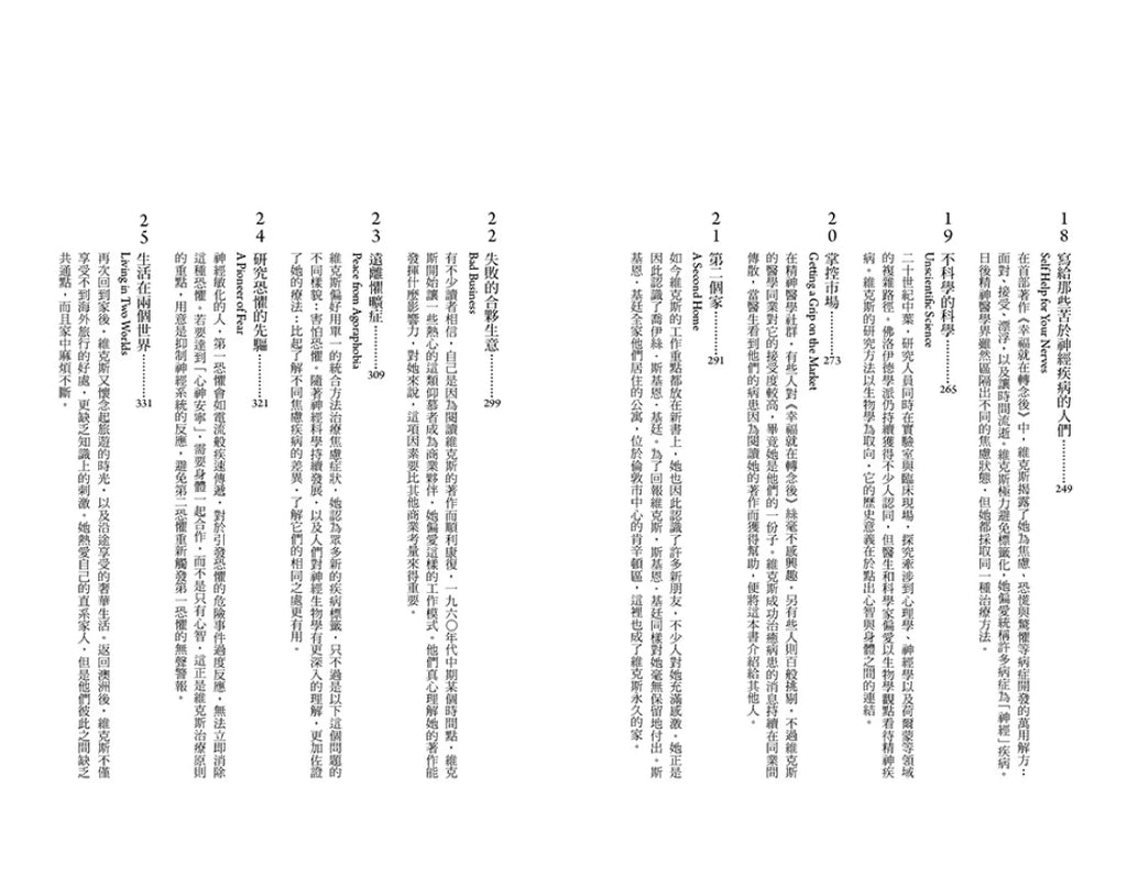 她是心理健康領域的研究先驅,徹底顛覆看待「焦慮」這個重大文明病的角度。《幸福就在轉念後》出版已是六十年前,至今持續再版、依然暢銷,繼續造福眾多有焦慮症困擾的人。即使在克萊兒・維克斯死後三十年的現在看來,她的治療方法依然先進,而且證實有效。然而,她的故事卻鮮為人知。這本書,就帶您一窺她走在時代前端的見解,以及她豐富且深具啟發的經歷。(更詳盡的內容介紹,請參見網頁中目錄的各章引文。)