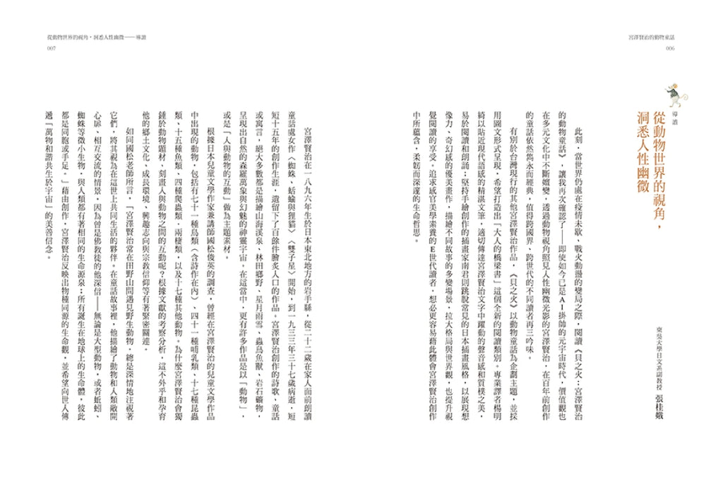 ◎即使已是AI掛帥的元宇宙時代,價值觀也在多元文化環境中不斷嬗變,透過動物視角映照人性幽微光影的宮澤賢治,在百年前創作的童話依然雋永而經典,值得跨國界、跨世代的不同讀者再三吟味。藉由創作,他反映出物種同源的生命觀,並希望向世人傳遞「萬物和諧共生於宇宙」的美善信念。——東吳大學日文系副教授 張桂娥