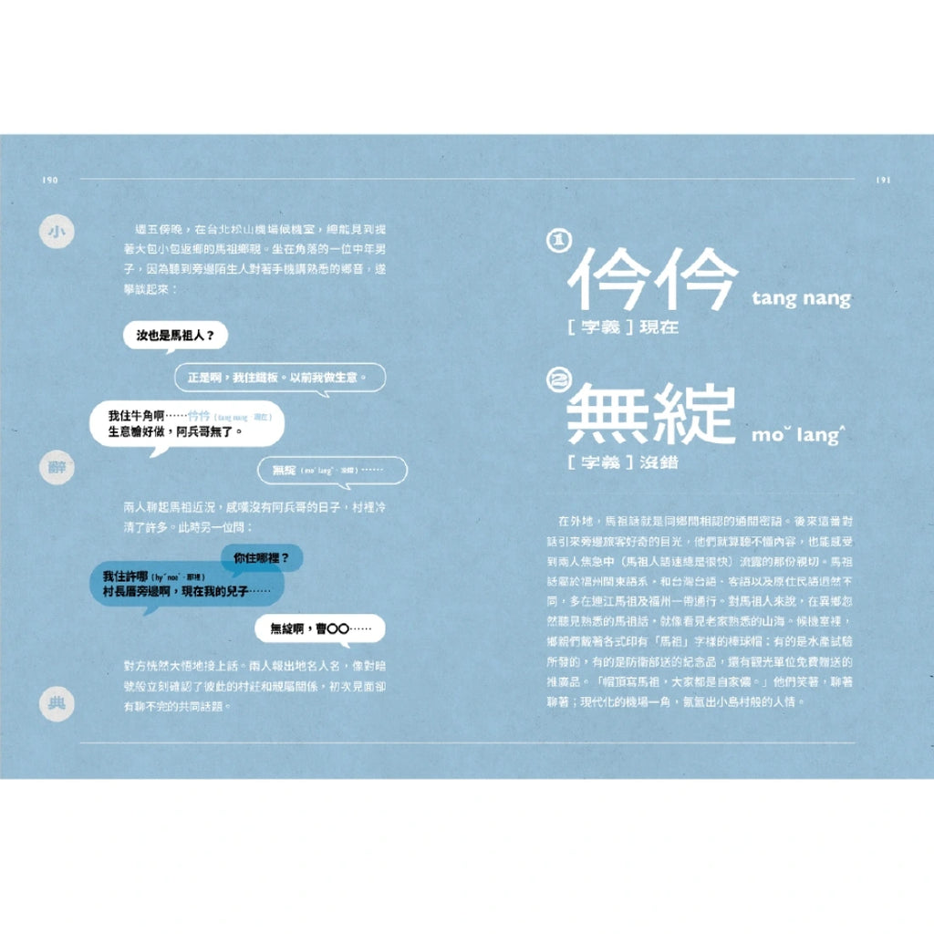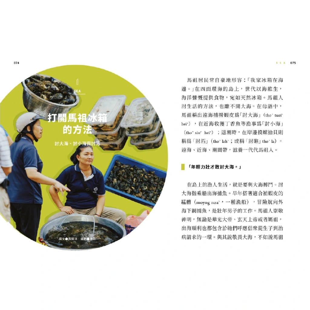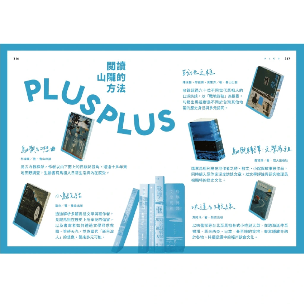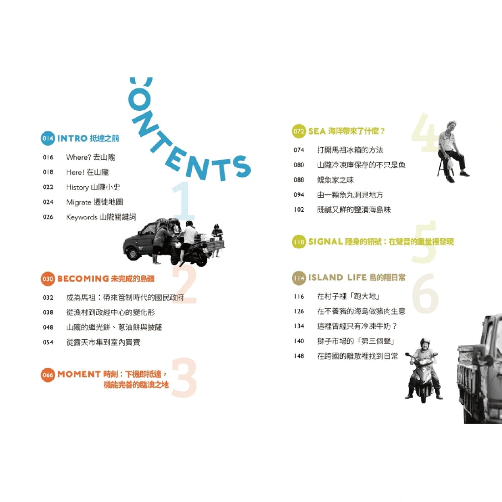 延續《誌村鑑》書系旅人友善的單元架構,從山隴的地方背景介紹出發,再以「BECOMING 未完成的島疆」、「SEA.海洋帶來了什麼?」兩單元切入這個村落何以在軍管背景下與眾不同,卻仍保有海洋性格的脈絡與線索。