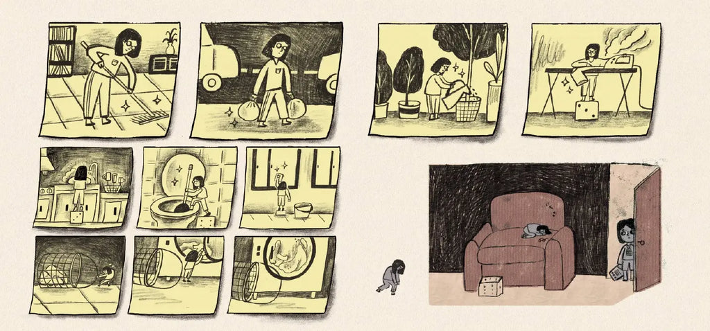 林廉恩則以豐富的構圖、類漫畫的分鏡、特寫,誇張的大小對比,精采表現故事中每個人心境的細微變化。書中設計兩幅大拉頁,展示了眾人期待的媽媽形象以及想要做自己的媽媽,描繪出微妙又充滿戲劇性的親子關係。