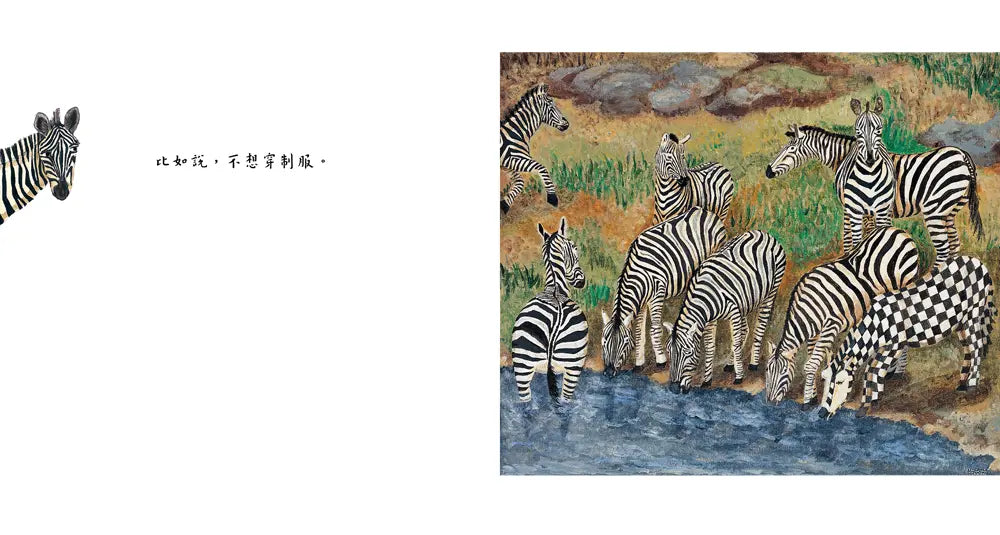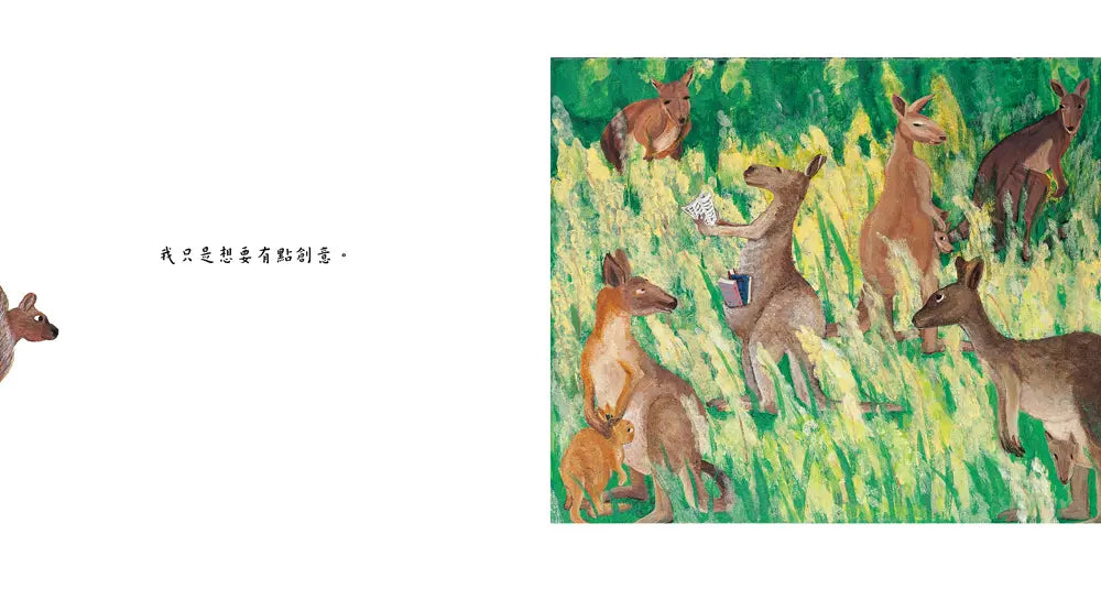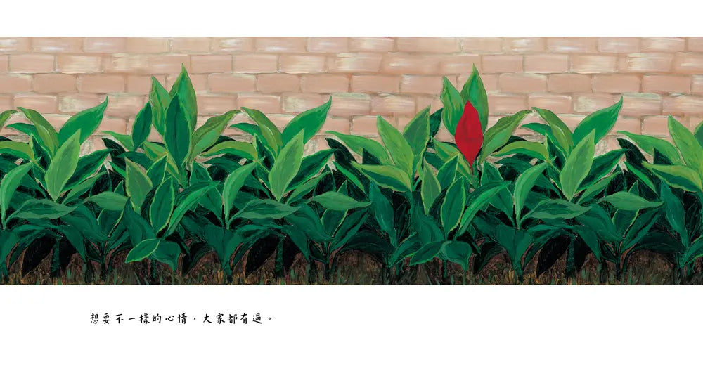 全書透過文、圖的對話與合作,每一幅跨頁,先以左頁自問式的文字,帶出對事物的感受與認知,再運用右頁俏皮、幽默甚至有些荒謬的圖像設計,藉著一個個同儕眼裡的「怪咖」,劃破整齊一致的畫面,不僅凸顯出個體「想要不一樣」的心情,給予「異類」同理與接納,也讓你我在莞爾一笑後不禁自問:我敢勇於說出自己的想法嗎?我也想要不一樣嗎?而當我們看到與眾不同的人、事、物時,又會有怎樣的反應呢?是投以異樣的眼光?還是起而效尤?是欣賞讚嘆、善意關照,或是冷漠的排斥?……