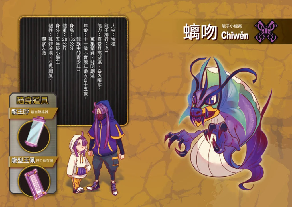 人類名為「蚩穩」,在九子中排行老二,特殊能力是登高望遠、發明創造。人類年齡為十一歲,實際年齡是五百一十五歲,是龍族中的青少年。個性聰明冷靜,身手敏捷。隨身配備有龍王呼(龍宮聯絡器)、龍形玉佩(神力保存器)、冰鎧甲、掌中絲和冰火雙槍。