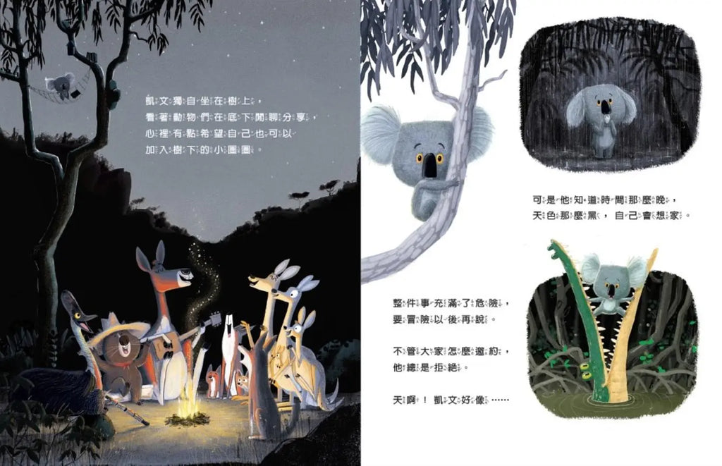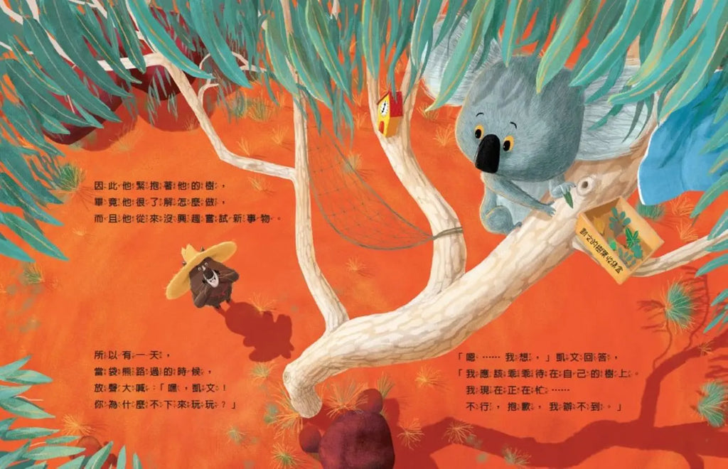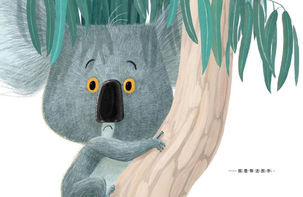 ★主角凱文是一隻膽小謹慎,缺乏冒險精神的無尾熊,為了維持一成不變的生活,他放棄了與動物朋友們一起玩耍、分享的機會,直到有一天,他的生活發生劇烈改變,他不得不放手離開緊緊抱住的大樹,試著勇敢跨出改變的第一步。