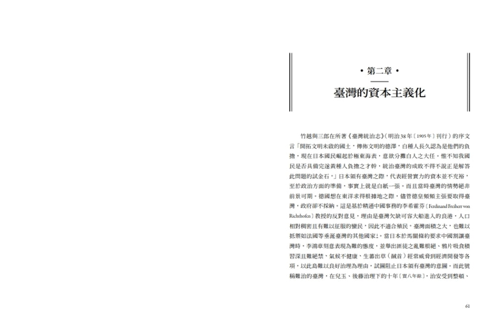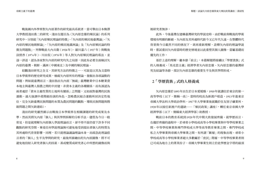本書自1929年出版至今,諸多立論已成學界定說,是日治臺灣研究的標竿之作。作者矢內原忠雄統整分析了1895年之後的整體史事,而著重能夠解釋全局的經濟議題。身為東京帝大經濟學教授,他敏銳的看出殖民政府必須讓臺灣對帝國有利,於是努力引進資本主義並百般維護,一切政策皆由此核心擘劃實行。以此觀點,日治時期的政治、產業、金融、司法、文教等看似互不相干又紛雜多端的單獨事實,便有了前後一貫的脈絡。