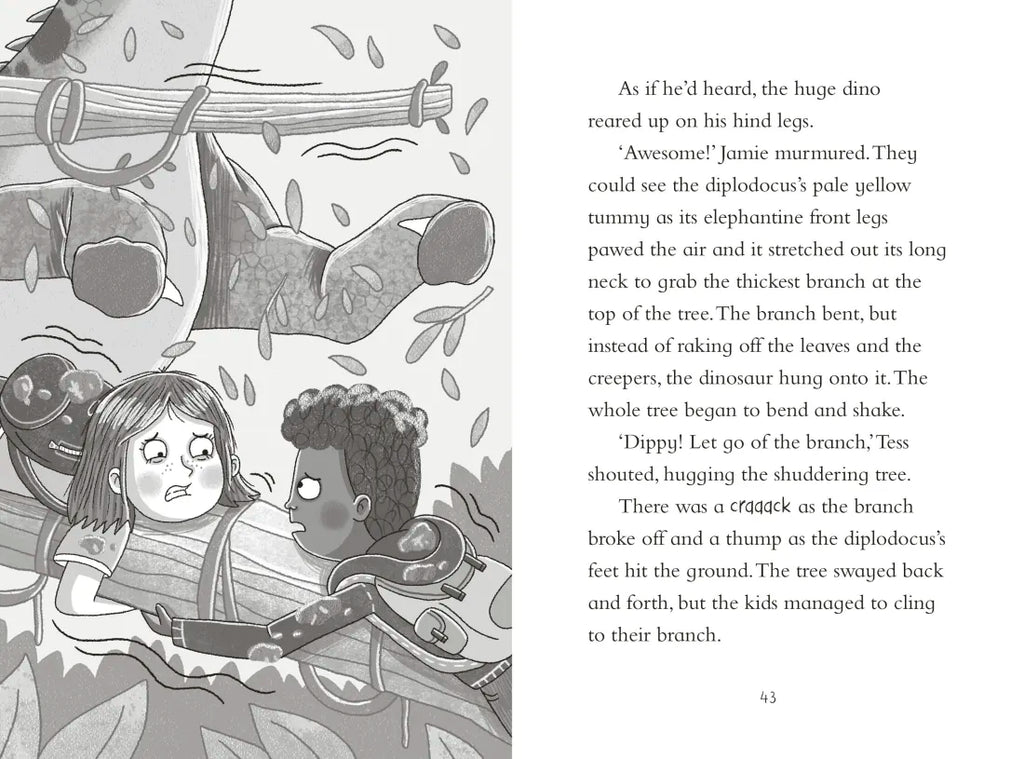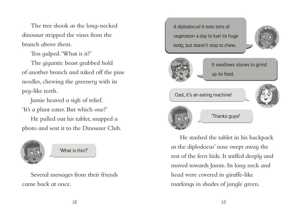 Meet Jamie, a member of the Dinosaur Club. They are a network of kids around the world who love to share dinosaur knowledge, help identify fossils, post dino discoveries, and chat about all things prehistoric. Jamie is exploring Ammonite Bay when he meets Tess, another member. Tess shows Jamie her favourite place - a secret cave with fossils all over the walls.