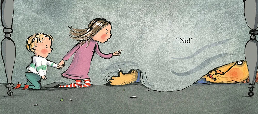 Dapper in his hat and flourishing a cane, a very large lion invites himself inside, inquires about Auntie Sue, and spins the two children of the house around the room in a silly dance. He doesn’t mind at all if they invite him to lunch, where he gobbles up all his greens and devours the plate, too. When he leans in to ask for dessert, his sharp teeth gleam oh so pearly white, and it seems very possible that he may just bite. . . . Surely it’s time to go-go-go — until, that is, the brave little girl finds her voice in a most satisfying way. The Cat in the Hat meets Pierre meets The Tiger Who Came to Tea in this rollicking story with an exhilarating ending.