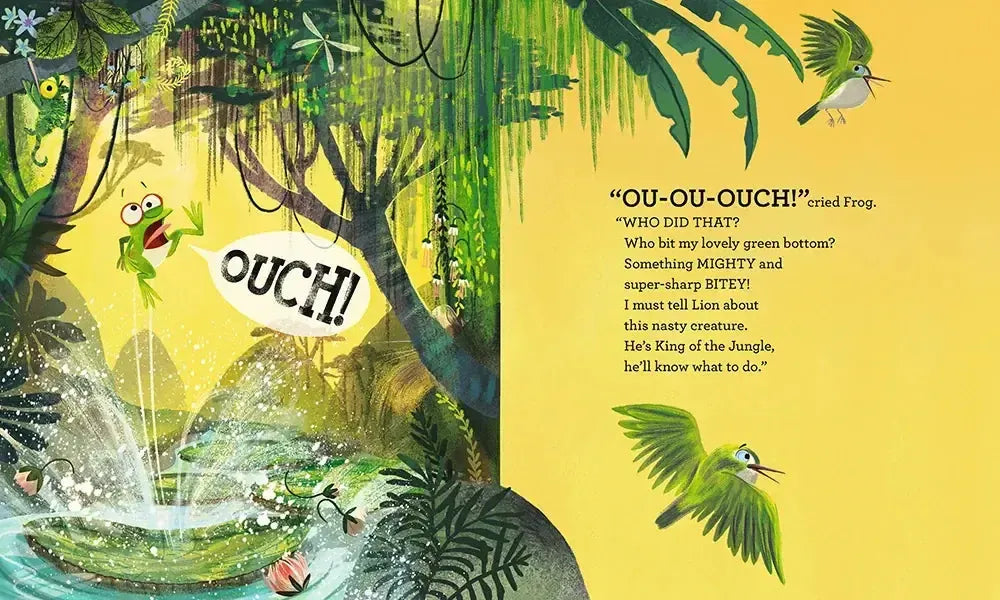 All is quiet in the jungle. But not for long! “Who bit my lovely green bottom?” shouts Frog. He rushes to tell King Lion, who will surely know just what to do. But soon Monkey (eek-eek-eek!) and Zebra (ya-a-a hooo!) encounter something mighty and bitey, too. Can the King of the Jungle save them all? What kind of creature would test its super-sharp teeth on everything it meets? Vivid illustrations, rhythmic language, and a surprise perpetrator combine for a rollicking read.