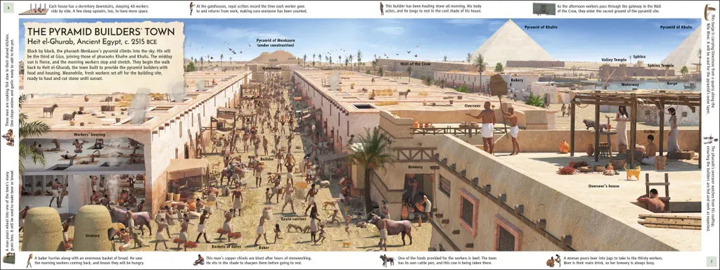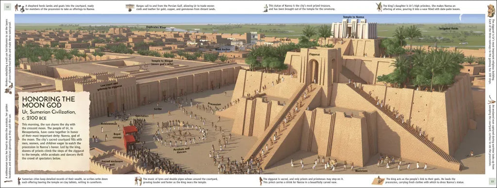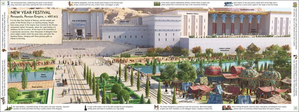 - A moment in time on each page, from battle action to a busy market, with annotations that break down each scene.