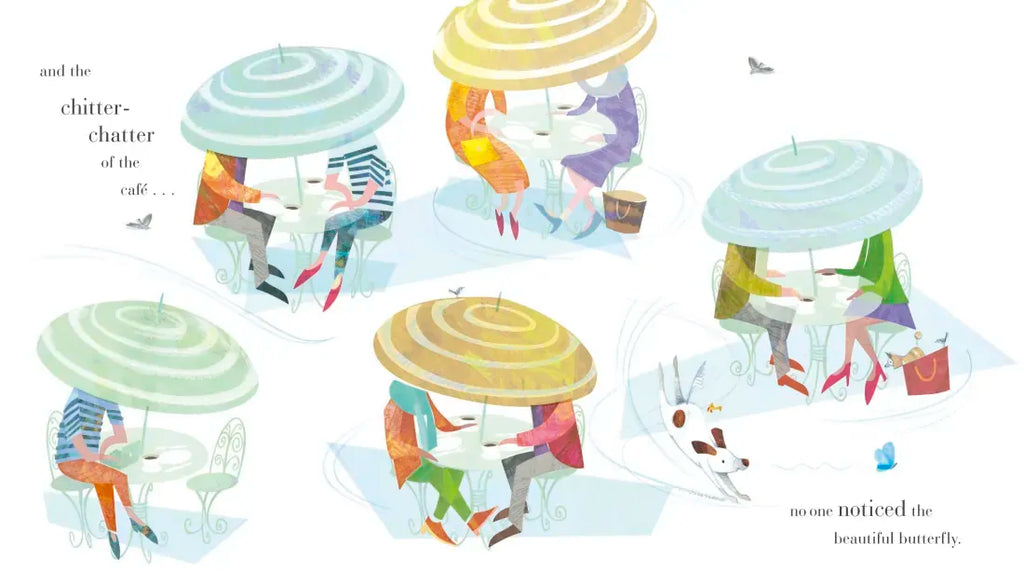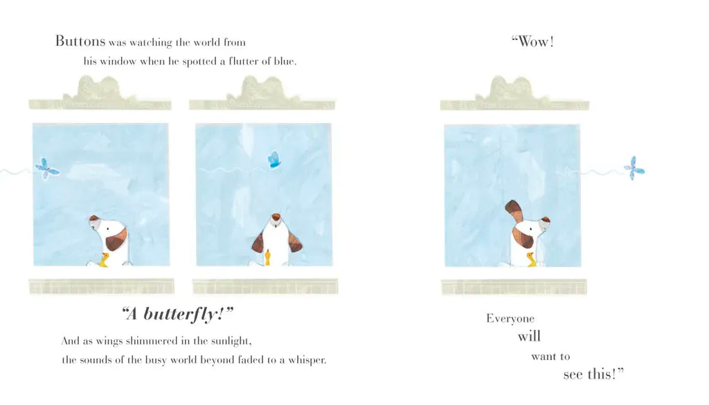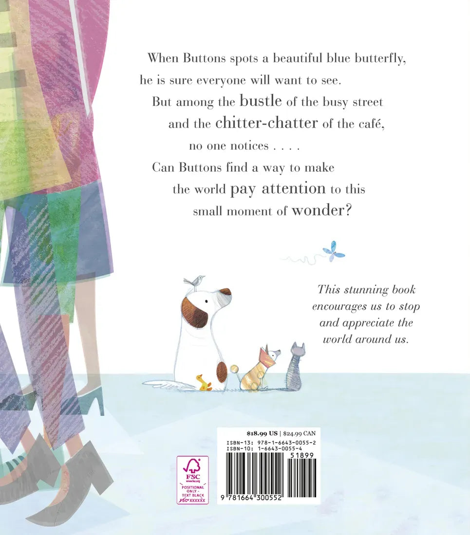 When Buttons the dog sees a beautiful blue butterfly, he is sure everyone will want to see it, too. But among the bustle of the busy street and the chitter-chatter of the café, no one notices the insect. He tries to encourage everyone he meets to stop and admire the wonder and beauty of the butterfly, but no one does. Is there anything he can do to get everyone to focus their attention on the beautiful insect? This inspiring story celebrates finding stillness in a busy world, and appreciating the little things in life.