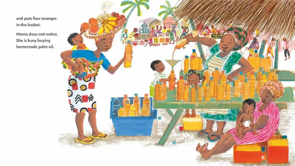 When Baby and Mama go to market, baby is so adorable that the banana seller gives him six bananas. Baby eats one and puts five in the basket, but Mama doesn't notice. As Mama and Baby wend their way through the market stalls, cheeky Baby collects five juicy oranges, four sugary chin-chin biscuits, three roasted sweetcorn, two pieces of coconut ... until Mama notices that her basket is getting very heavy. Poor Baby, she thinks – he must be very hungry by now!