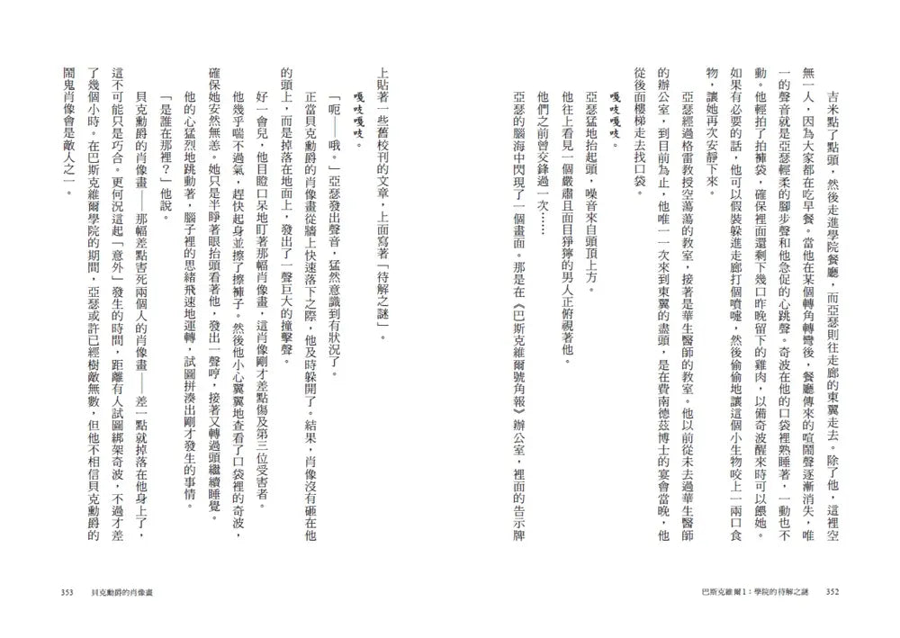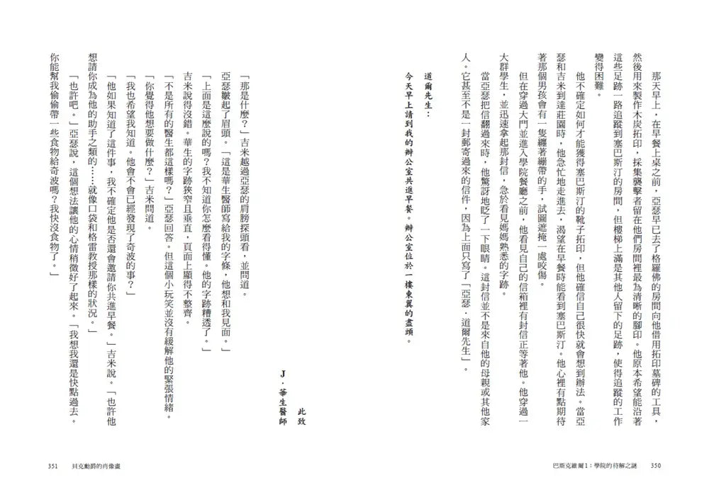 另外,校園外的綠色騎士、學校層出不窮的竊盜事件與學院中許多待解謎團,都讓亞瑟絞盡腦汁。在這之中,亞瑟也將遇見他未來最重要的啟蒙老師——福爾摩斯。這一切充滿可能,或看似過度奇想的經歷,都將啟發亞瑟在未來創造出一個又一個舉世難忘的文學角色。
