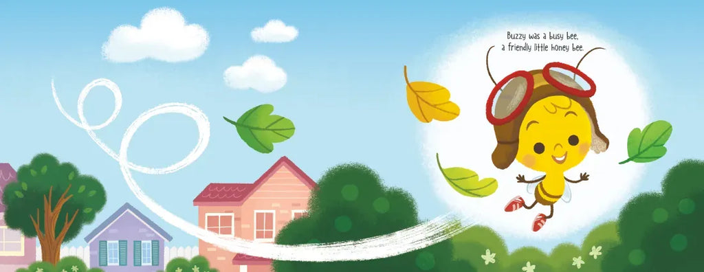 Buzzy was a busy bee, a friendly, little honey bee.