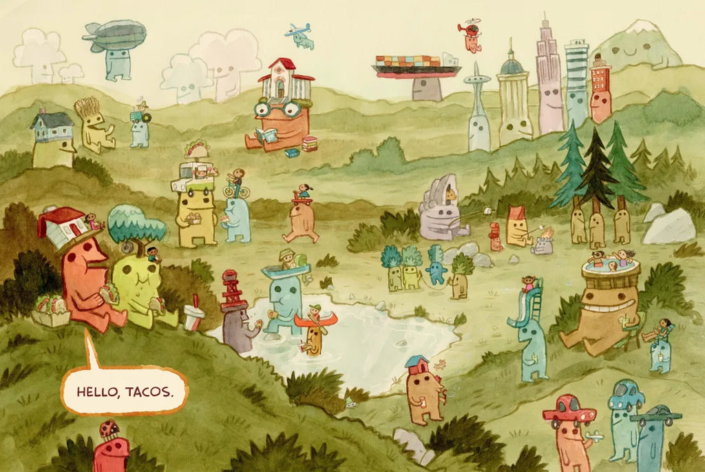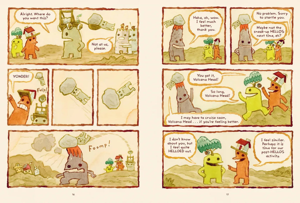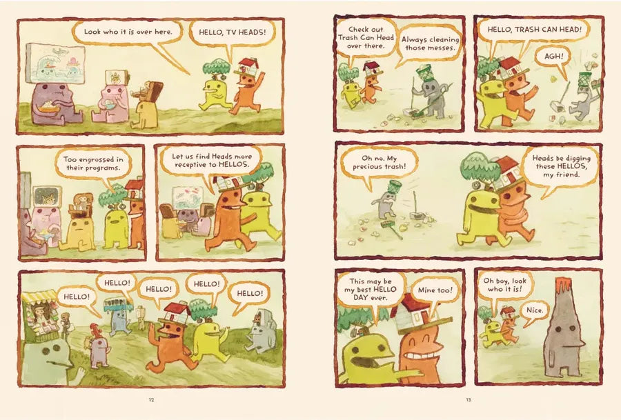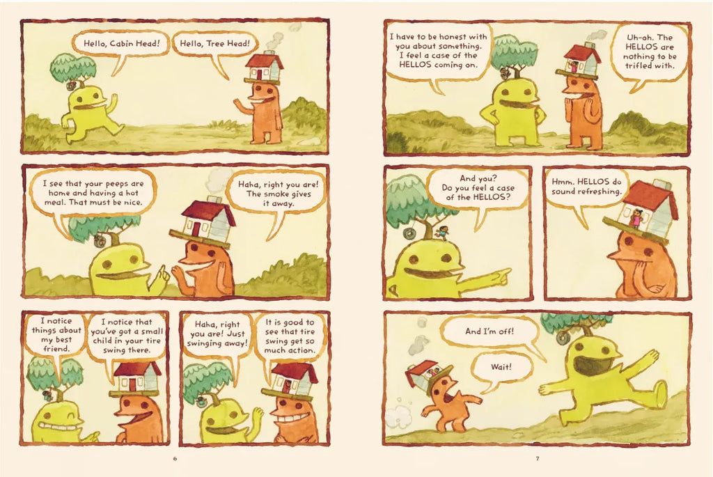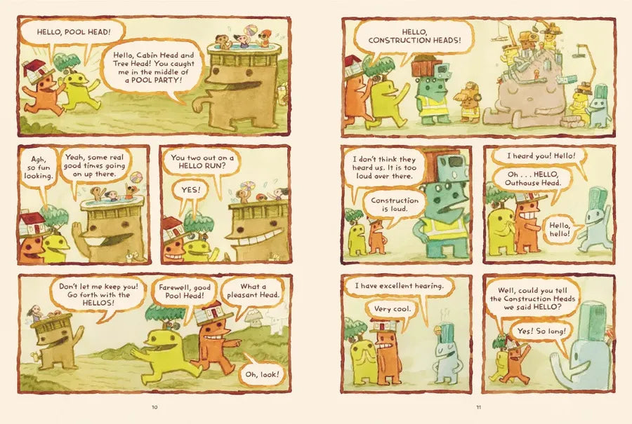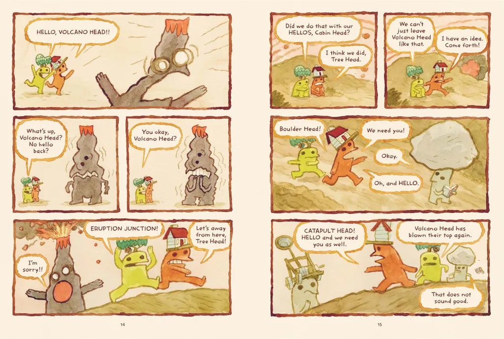 Whether drawing or hiding or just saying HELLO or BYE-BYE, Cabin Head and Tree Head are irresistible buddies who have fun together, support one another's ideas (digging for treasure without a map) and help one another overcome challenges (bad leafcuts!). These are lighthearted tales of two pals who think differently — and entirely embrace it — set in a landscape of equally unforgettable characters such as Automobile Head, Volcano Head and Trash Can Head. Let’s go hang out with all the Heads!