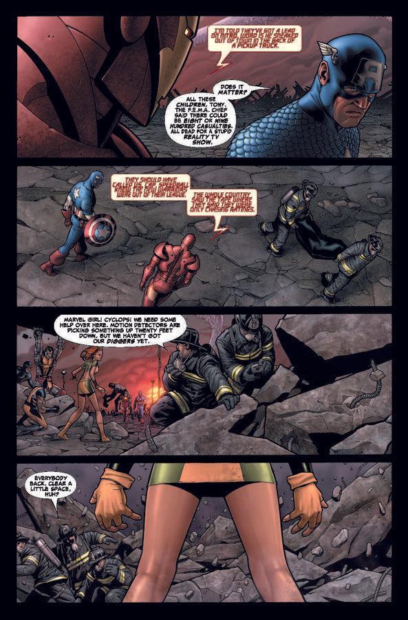 Divided, the nation’s greatest champions each must decide how to react — a choice that will alter the course of their lives forever. Captain America rejects the Act and goes underground, while Iron Man steps up to spearhead the registration effort — and Marvel’s heroes split right down the middle!