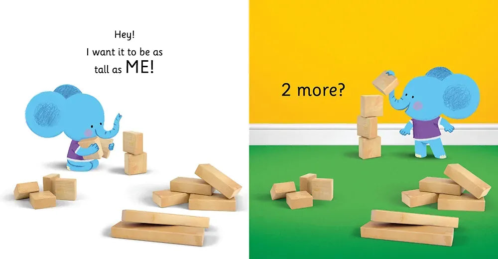 Elephant has a bucket of blocks and wants to build something tall. Something as tall as Elephant. But will it stay up? CRASH! BOOM! Not this time. Build it again? One block. Two blocks? Four blocks? It’s still not as tall as Elephant. More blocks! Now will it stay up? Now will it be as tall as Elephant? Build, balance, count — question, estimate, measure — predict, crash, and build again! Young children will happily follow along as Elephant goes through the ups and downs of creating something new and finally celebrates the joy and pride of success.