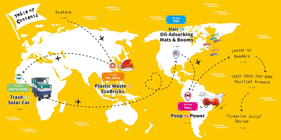 CRAZY IDEAS THAT WORK is a creative science picture book that combines STEAM education with the concept of “Creative Transformation”, turning everyday objects and waste into innovative, useful products. Through four real-life cases—transforming plastic waste into sustainable concrete, trash into solar-powered cars, hair into oil spill mats, and poop into energy—it shows how creativity paired with science can turn trash into treasure.