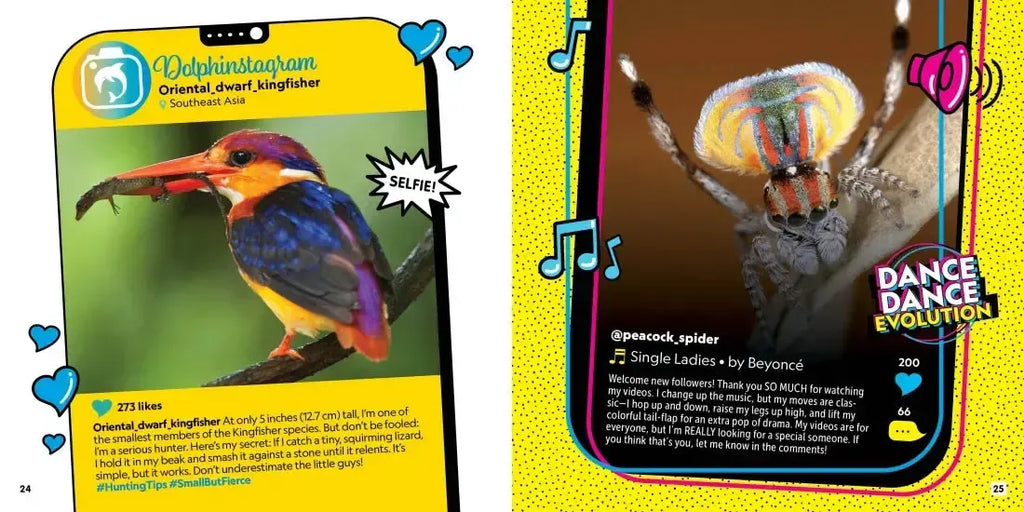Among these silly conversations, you'll find tons of parody social media posts from all your favorite animals—and some you probably haven't heard of—including Instagram-style selfies (#WildStyle), meal reviews on animal Yelp, and profiles of critters looking for love on BeeHarmony. Plus, sprinkled throughout are fascinating nonfiction features that give you the scoop on the absolutely real ways that animals communicate, as well as bios of real-life animal influencers making a name for themselves online today.
