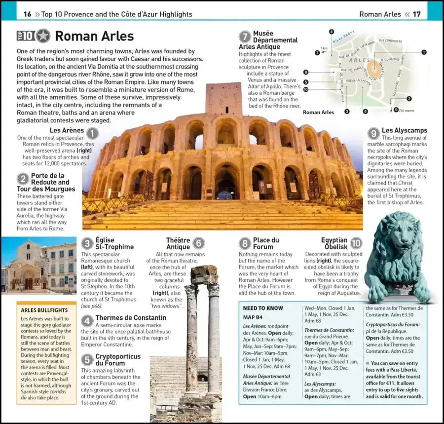 • Detailed Top 10 lists of Provence and the Côte D’Azur must-sees, including detailed descriptions of the Palais des Papes, Gorges du Verdon, Roman Arles, Aix-en-Provence, Vieux Nice, St-Tropez, the Camargue, Vaison-la-Romaine, Abbaye Notre-Dame de Sénanque and Casino Monte Carlo