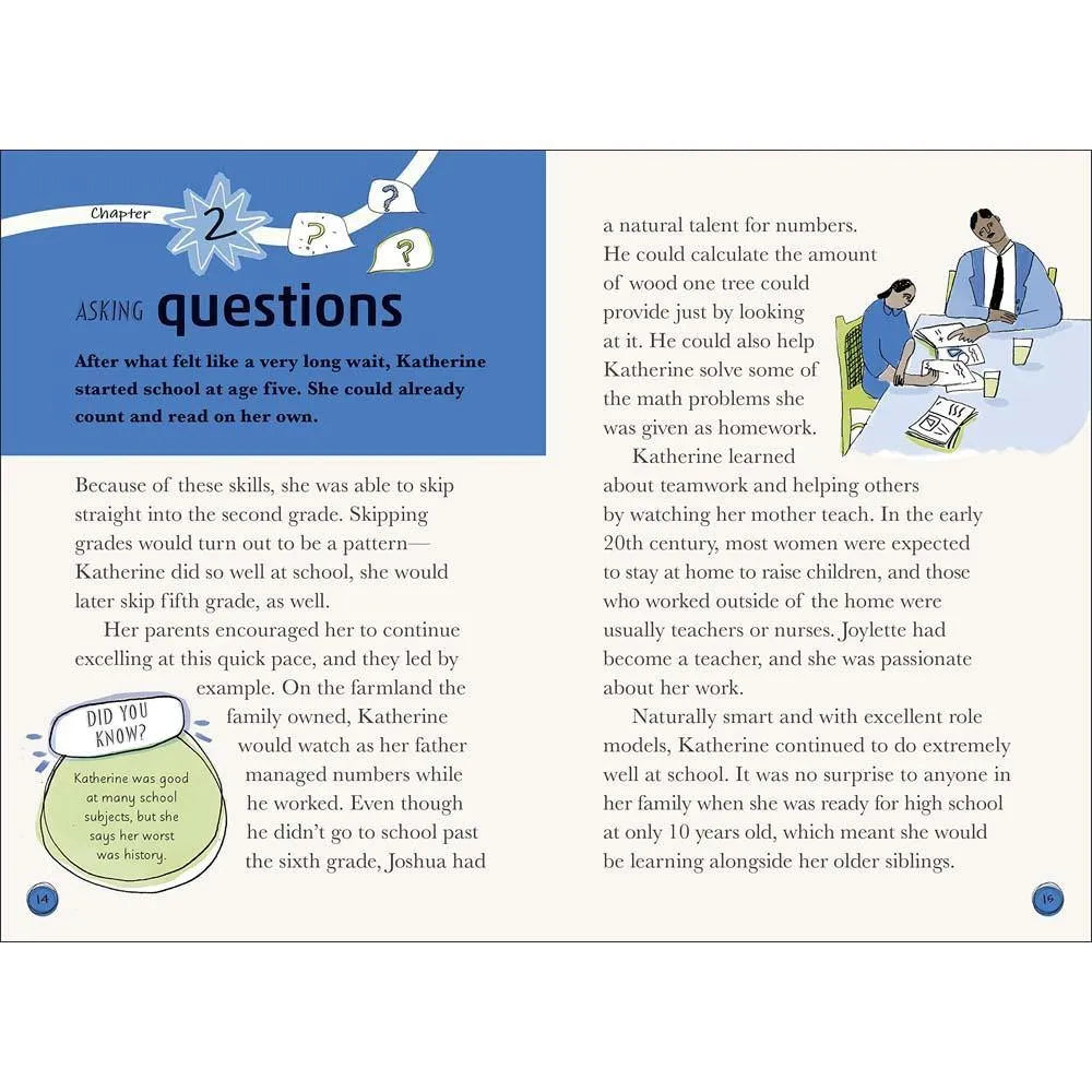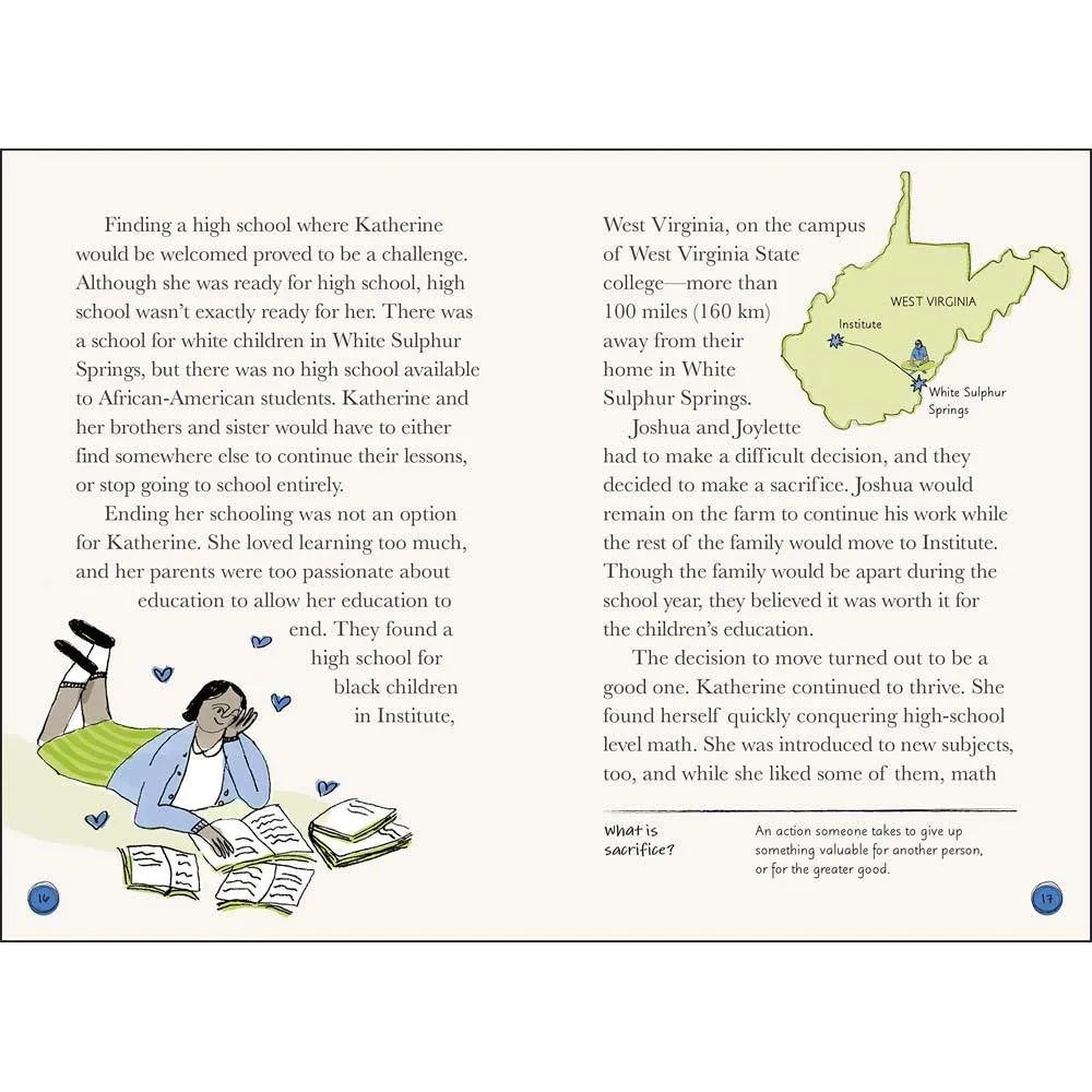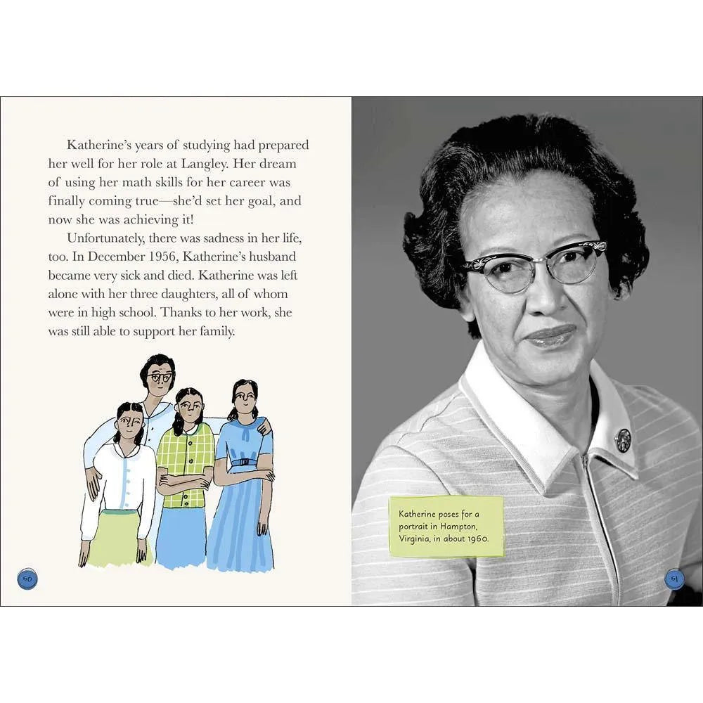 It was an incredible accomplishment when the United States first put a person on the moon--but without the incredible behind-the-scenes work of NASA mathematician Katherine Johnson, such a feat could not have been possible. In this biography for kids ages 8-12, follow Katherine's remarkable journey from growing up in West Virginia, to becoming a teacher, to breaking barriers at NASA and receiving the Presidential Medal of Freedom in 2015.