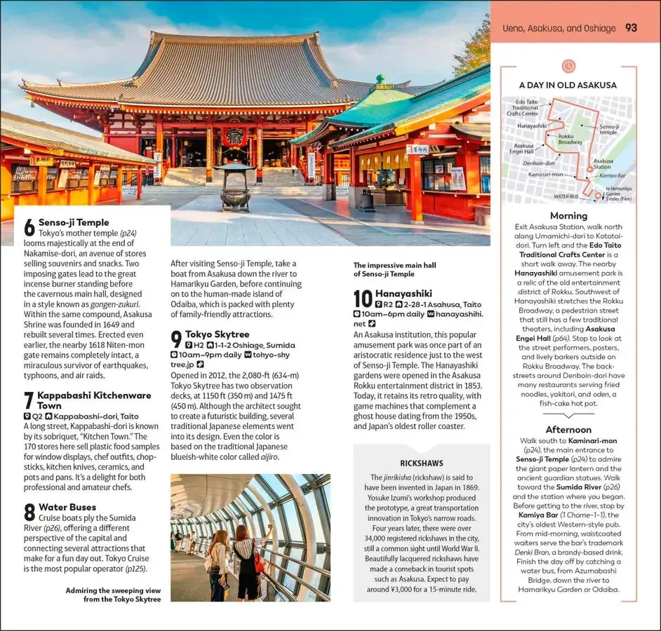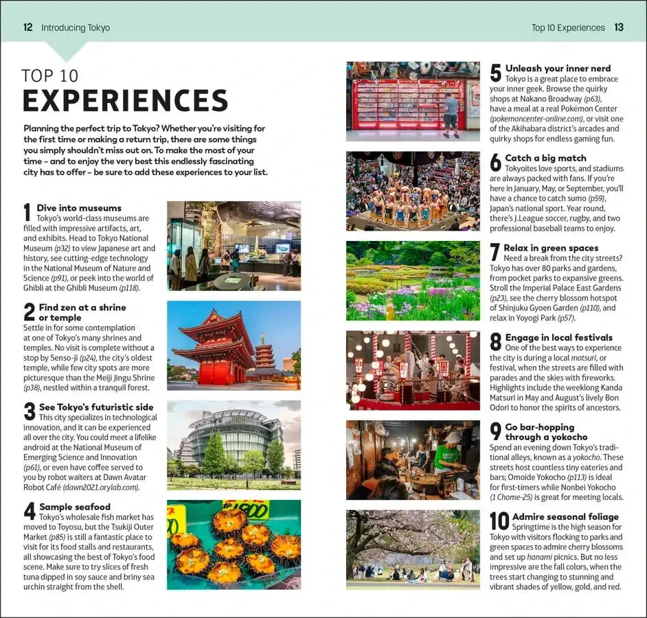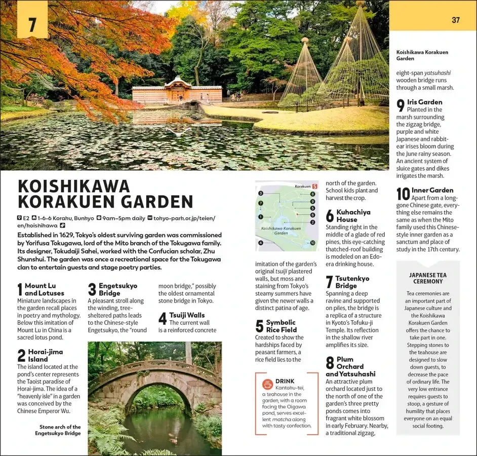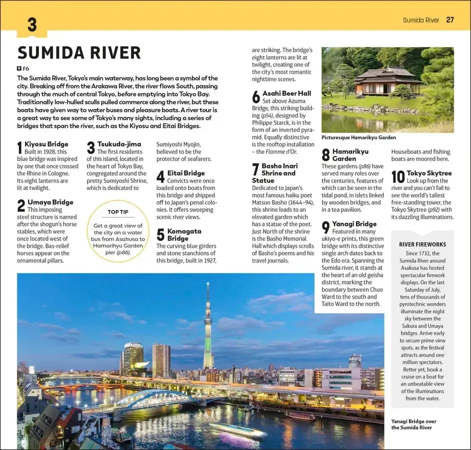 • Detailed Top 10 lists of Tokyo’s must-sees, including detailed breakdowns of the Imperial Palace Grounds, Senso-ji Temple, the Sumida River, the Edo-Tokyo Museum, Ueno Park, the Tokyo National Museum, Koishikawa Korakuen Garden, the Meiji Shrine, Yanaka and Odaiba Island